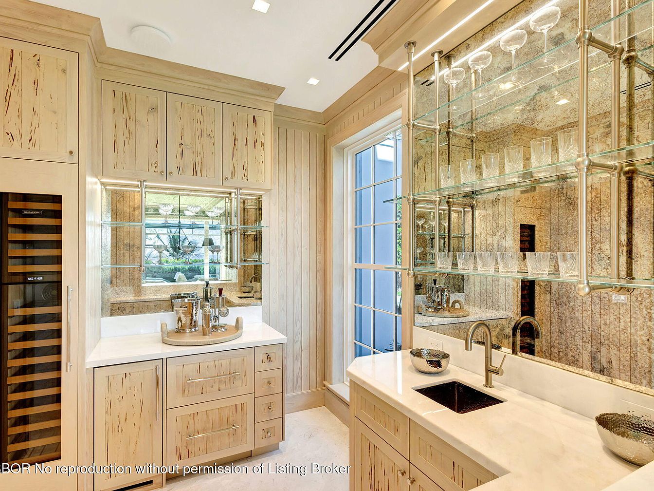 This stylish home bar features a seamless blend of functionality and elegance. The cabinets, crafted from light-toned wood with a natural finish, provide ample storage while showcasing the beauty of the wood grain. A sleek marble countertop complements the warm color scheme, enhancing the inviting atmosphere. Above, a glass shelving unit displays an array of glassware, effortlessly adding sophistication. An integrated wine cooler ensures refreshments are always within reach. The spacious layout allows for easy entertaining, while large windows flood the area with natural light, creating a bright and airy space perfect for family gatherings or intimate soirées.