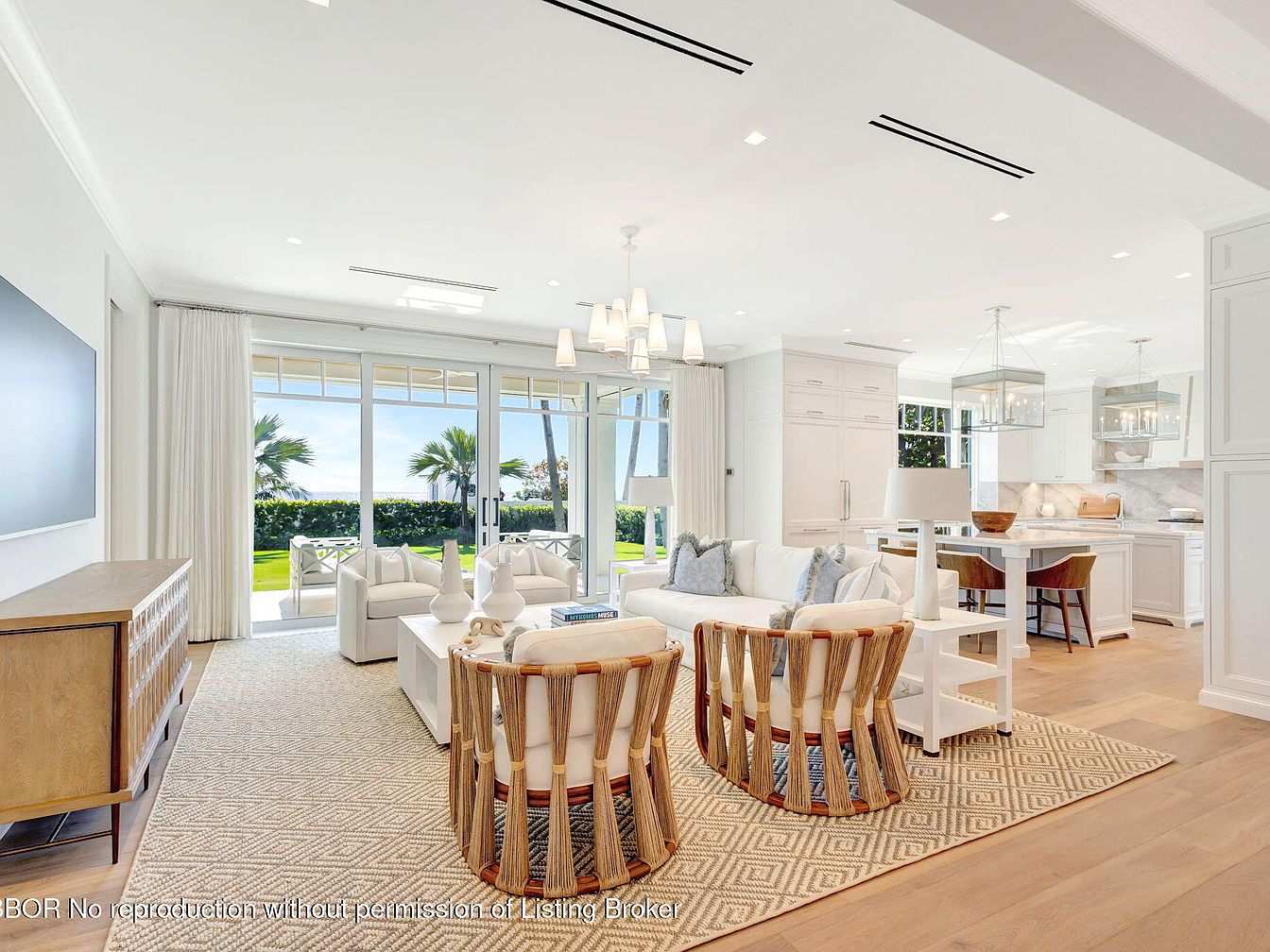 Bright and airy, this living room exudes coastal charm with its open layout, seamlessly connecting to the outdoor space. Soft white walls and sleek wooden accents create an inviting atmosphere. The plush sectional sofa is adorned with light blue pillows, enhancing the serene color palette. Unique chairs with woven details provide a playful contrast, while a textured area rug grounds the space. Sunlight pours in through expansive glass doors, offering stunning views of the garden. Elegant pendant lighting suspends above the dining area, complimenting the luxurious finishes in the kitchen, making it perfect for family gatherings.