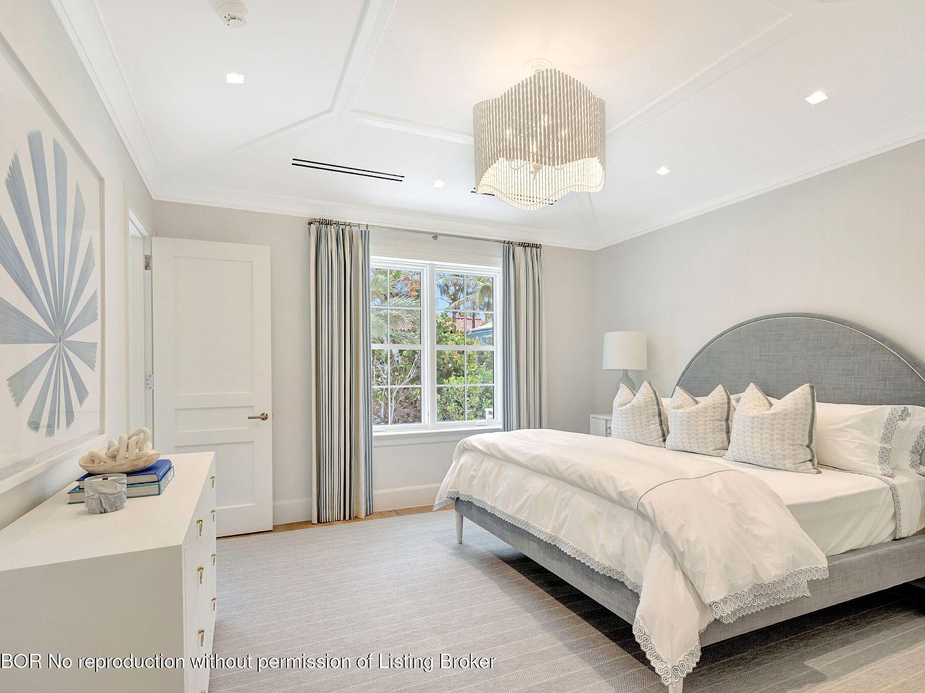 This serene master bedroom features a harmonious blend of comfort and elegance. A plush king-sized bed, adorned with crisp white linens and decorative pillows, invites relaxation. The soft muted color scheme, with shades of gray and white, is further enhanced by a chic chandelier that casts a warm glow across the space. Expansive windows dressed with delicate curtains allow natural light to flood in, showcasing a beautiful outdoor view. A sleek dresser in a modern style adds functional flair, while thoughtful architectural details, like crown molding and recessed lighting, create an inviting atmosphere perfect for rejuvenation.