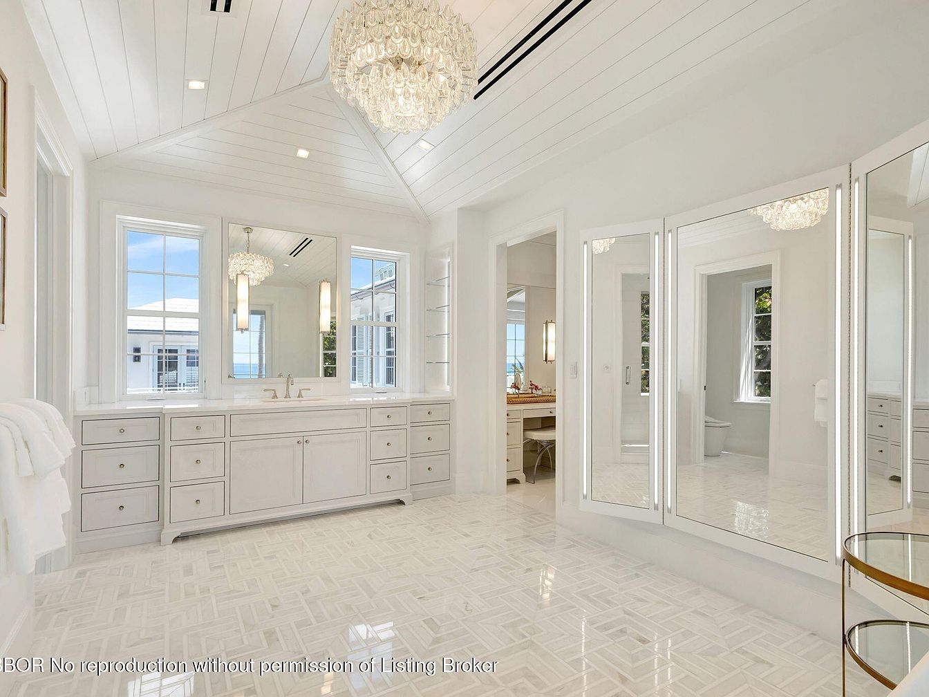 This luxurious bathroom features a spacious layout with an elegant aesthetic. Light pours in through large windows, highlighting the stunning white cabinetry and intricate tile flooring. A stylish double sink is complemented by chic fixtures, and the high ceiling adorned with a beautiful chandelier adds a touch of glamour. The soft color palette of whites and creams creates a serene atmosphere, perfect for relaxation. Ample storage is provided by sleek drawers and cabinets, ensuring the space remains tidy and organized. Large mirrors reflect natural light, enhancing the openness of the room, making it a perfect family-friendly retreat.