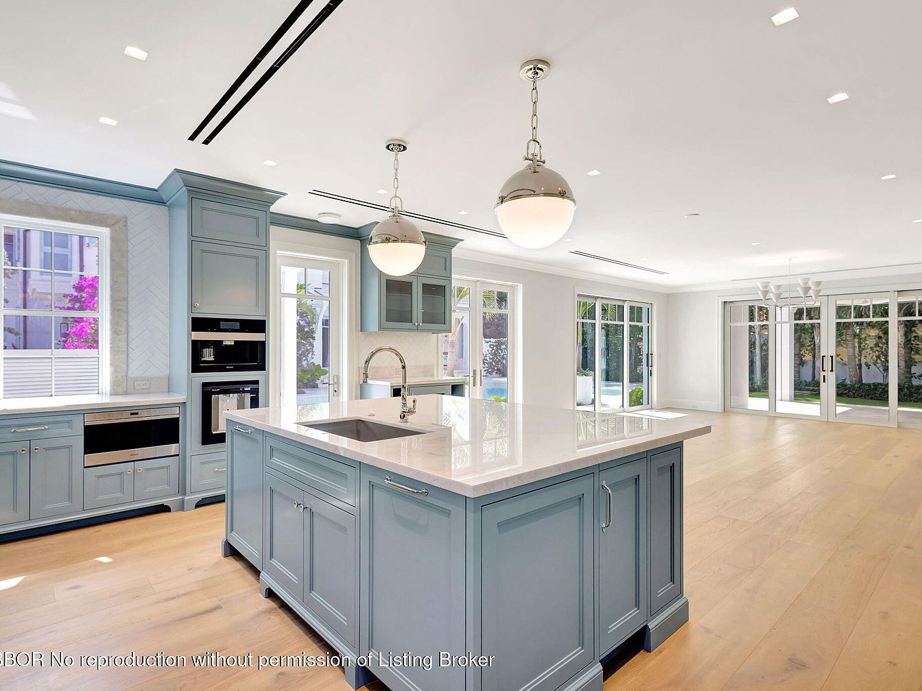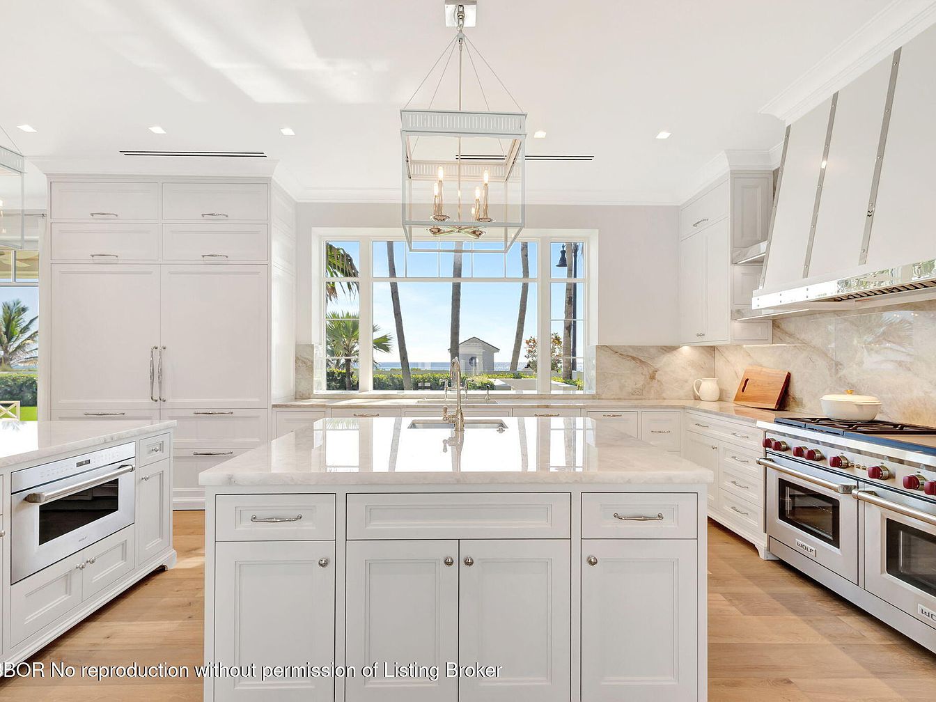 This modern kitchen features a seamless open layout, flooded with natural light from expansive windows framing views of palm trees and a serene outdoor space. The pristine white cabinetry complements the sleek marble countertops, enhancing the room’s airy ambiance. A spacious island serves as a focal point, providing ample space for meal prep and casual dining. High-end appliances, including a professional-grade oven, invite culinary creativity. Stylish pendant lighting adds a touch of elegance while ensuring a warm atmosphere. Designed with functionality and aesthetics in mind, this kitchen is perfect for family gatherings and entertaining guests.