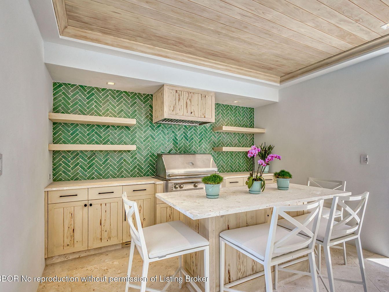 This sleek kitchen blends functionality with style, showcasing a spacious layout ideal for family gatherings. The standout element is the vibrant green herringbone backsplash, creating an eye-catching focal point. Natural wood cabinetry contrasts beautifully against the bright walls, adding warmth and texture. Open shelving offers an airy feel while providing practical storage. A large kitchen island with a polished countertop invites casual dining, complemented by white cross-back chairs enhancing comfort. Thoughtfully placed potted plants and fresh flowers uplift the ambiance, making the space feel inviting and vibrant. The soft natural light streaming in further enhances its charm.