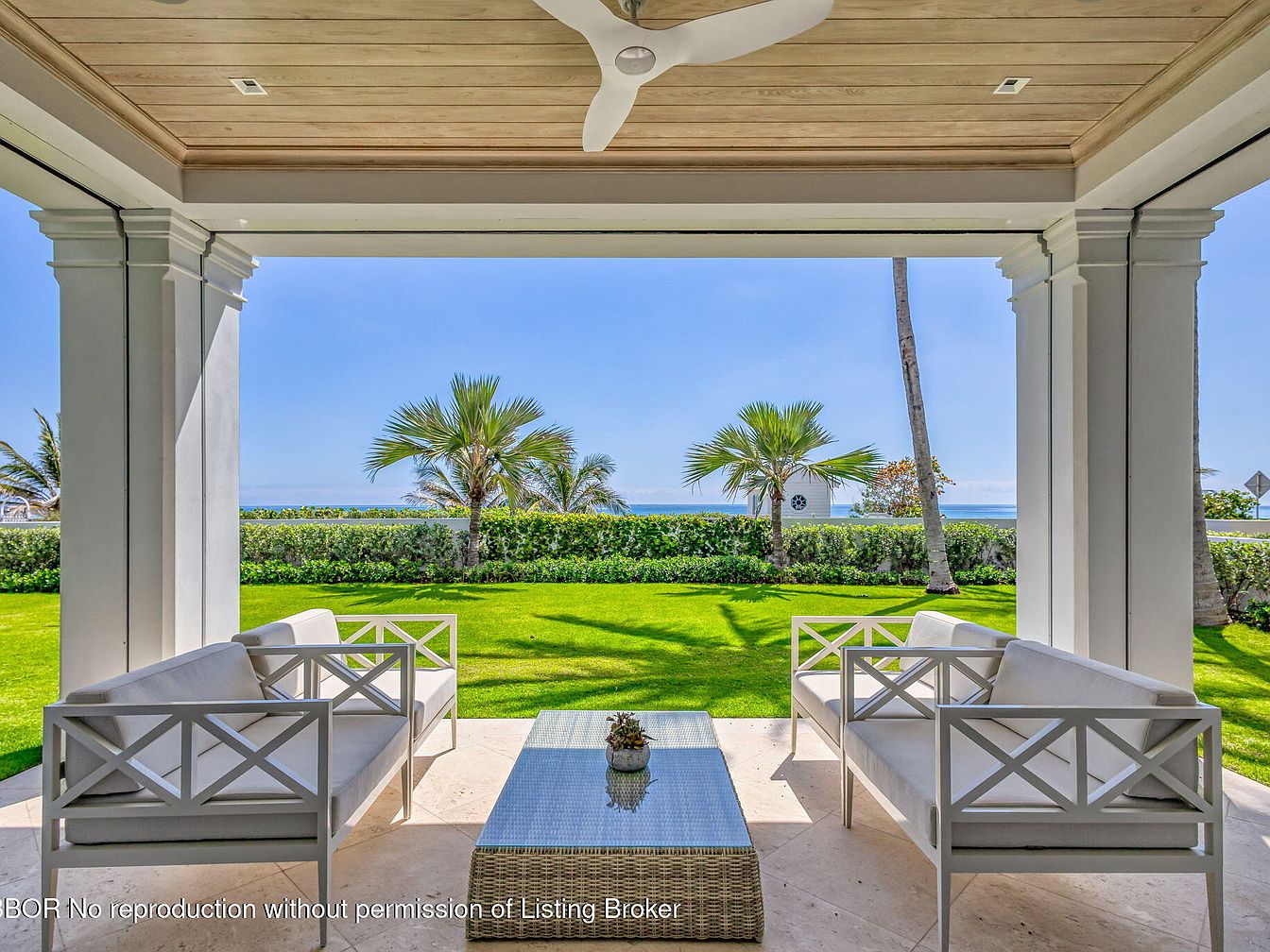 This inviting patio seamlessly blends indoor comfort with outdoor tranquility, framed by lush greenery and the sparkling ocean view. The space features stylish, light-colored seating with a modern geometric design, creating an elegant focal point. A sleek glass-topped coffee table adds functionality, perfect for casual gatherings. The warm wood ceiling contrasts beautifully with the crisp white columns, enhancing the home’s coastal vibe. Multiple palm trees sway gently in the breeze, ensuring a serene atmosphere. This family-friendly space is designed for relaxation and entertaining, offering a picturesque setting for creating lasting memories with loved ones.