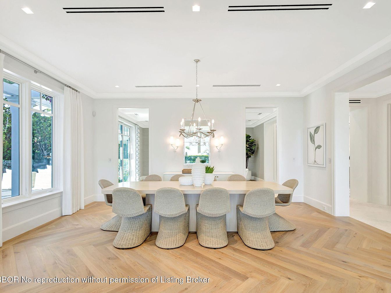 This dining room offers a blend of modern elegance and family-friendly functionality. Flooded with natural light from expansive windows, the space features a large, minimalist table surrounded by stylish, textured chairs that enhance comfort. The warm tones of the herringbone hardwood floor complement the soft neutral color scheme of the walls and furnishings, creating a serene atmosphere. An eye-catching chandelier elegantly hangs above the table, adding a touch of sophistication. Thoughtful architectural details, such as coffered ceilings and framed artworks, provide an inviting backdrop, ideal for both intimate family meals and entertaining guests.
