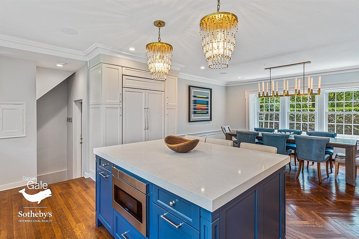 This open-concept kitchen and dining area blends modern sophistication with family-friendly design. The centerpiece is a striking blue island topped with gleaming white quartz, complemented by brass-accented chandeliers for a luxurious touch. Crisp, white cabinetry lines the wall, offering ample storage and seamlessly integrating major appliances. Adjacent, a spacious dining area is set with plush blue velvet chairs and a long wooden table, perfect for large family meals or entertaining guests. Expansive windows fill the space with natural light and create an inviting atmosphere, while warm hardwood floors and contemporary art add character and comfort.