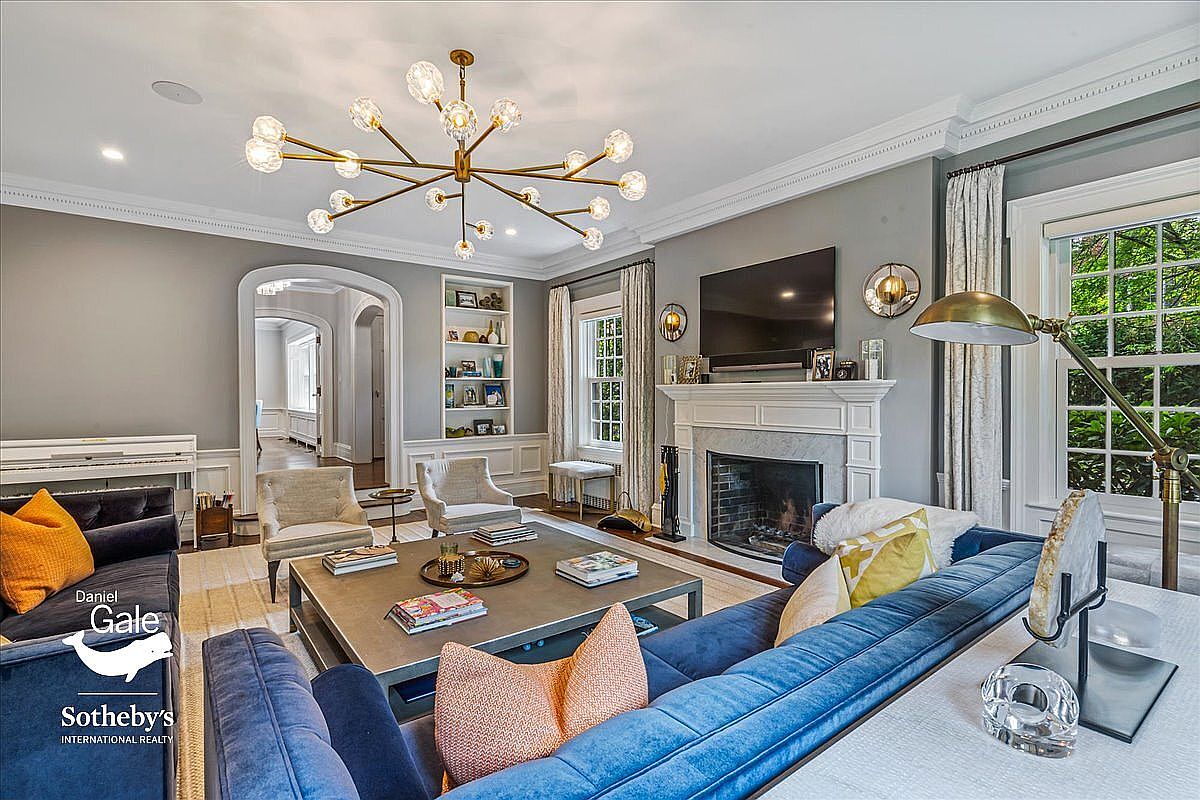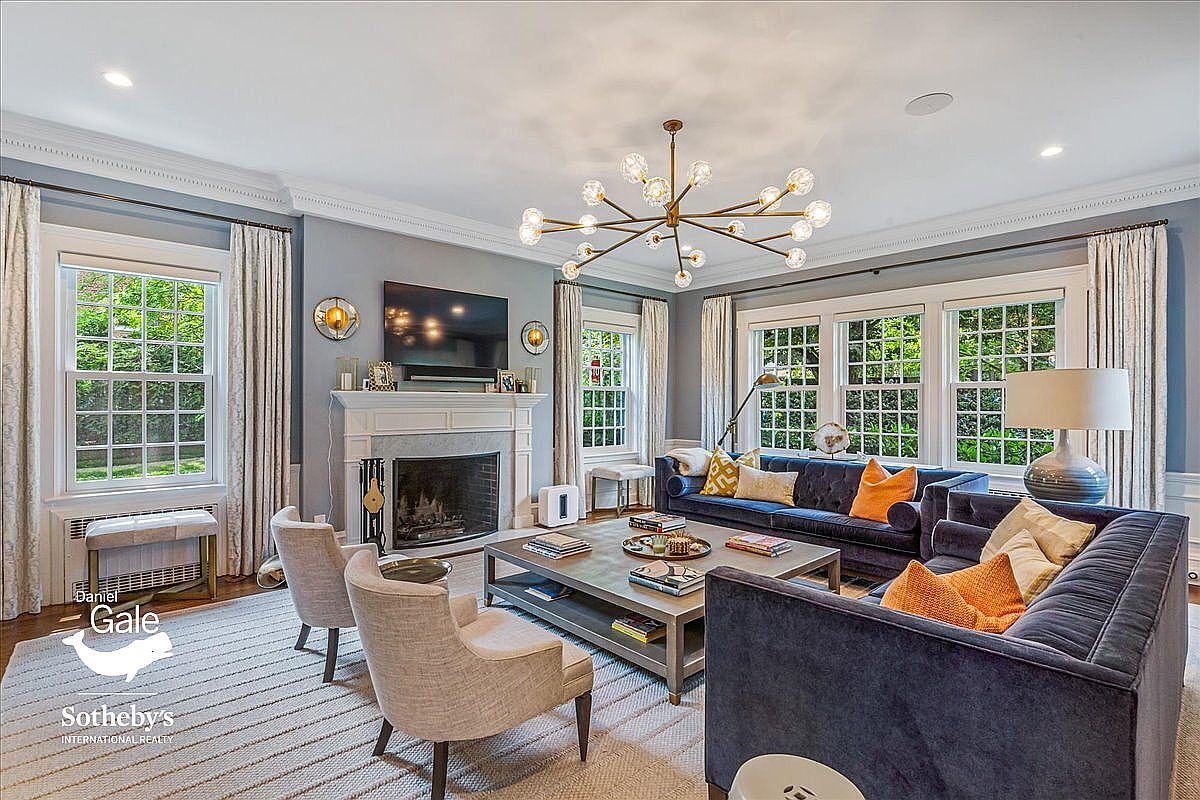 This spacious living room is designed for both comfort and style, featuring a cozy yet sophisticated layout with plush navy blue sofas arranged around a central coffee table. The neutral-toned armchairs and textured area rug create a welcoming and family-friendly atmosphere, perfect for gatherings or relaxation. Large windows bathe the room in natural light, highlighting the soft blue-gray walls and classic white trim. The modern chandelier adds a touch of drama, while the fireplace and built-in shelving deliver both function and charm. Warm orange and yellow accent pillows provide pops of color against the sleek, elegant furniture.