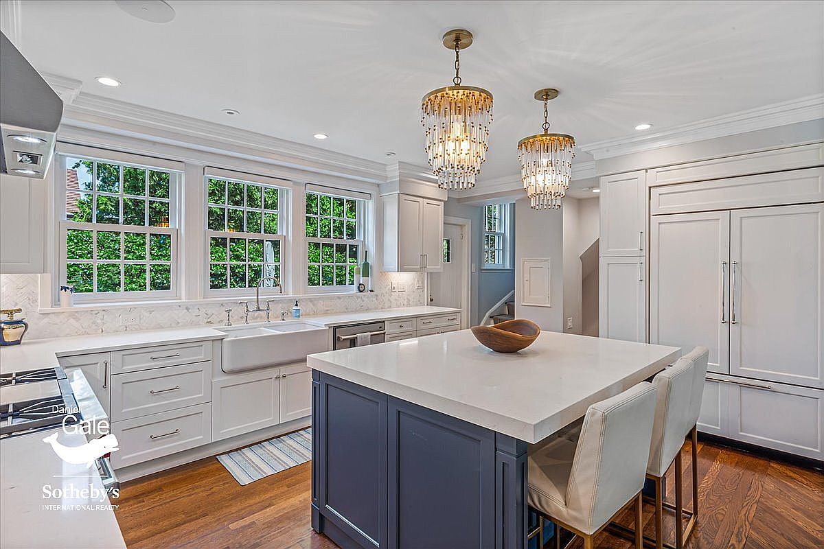 This spacious kitchen features a beautiful central island with a sleek, white countertop, bringing both elegance and functionality to family living. Soft grey and white cabinetry complements the natural light pouring in from large grid-style windows, creating an inviting and bright atmosphere. The farmhouse sink adds a classic touch, while dual statement chandeliers introduce a sense of luxury and warmth. Hardwood floors add cozy charm, while the seamless layout promotes easy movement, perfect for both cooking and gathering. Comfortable barstools foster a family-friendly feel, making this kitchen the heart of the home for everyday meals or entertaining guests.