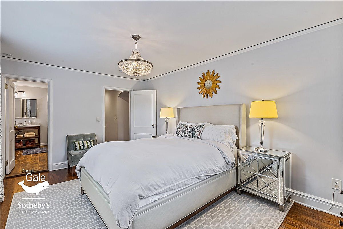 This spacious master bedroom exudes a sense of calm, with a soft palette of light gray and white tones complemented by warm wooden flooring. The large upholstered bed is the centerpiece, flanked by elegant mirrored nightstands and matching table lamps that provide a cozy, ambient glow. A plush patterned area rug sits beneath the bed, adding comfort underfoot, while a stylish chandelier overhead elevates the room’s sophistication. Thoughtful family-friendly touches include a cushioned accent chair for reading or relaxing and easy access to an ensuite bathroom. Clean lines and tasteful décor create a serene atmosphere perfect for rest.