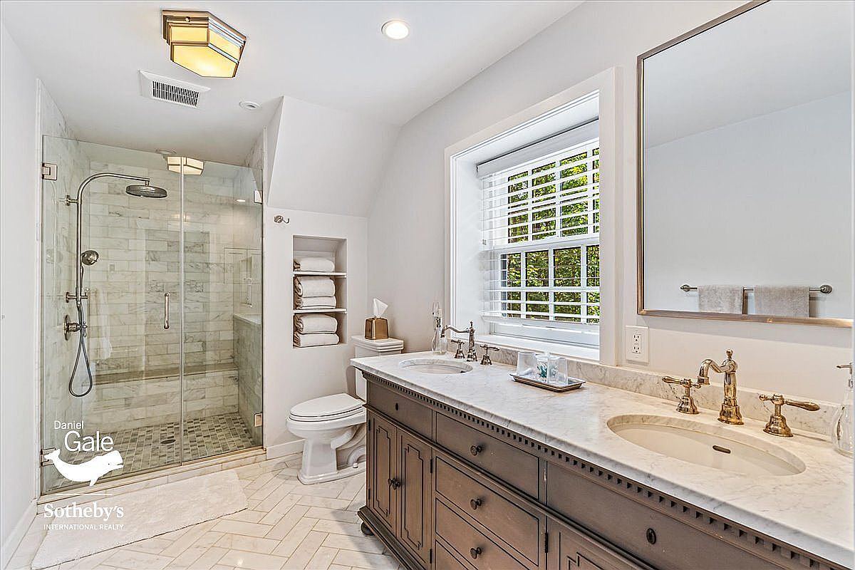 A spacious and bright bathroom is highlighted by a double-sink vanity with marble countertops and brass fixtures, perfect for busy mornings with the family. The large walk-in shower features a glass enclosure and built-in bench, with elegant marble tile walls for a sleek, timeless look. White herringbone tile flooring adds texture and modern charm, while ample cabinetry provides plenty of storage for essentials. Built-in shelving beside the toilet is neatly stacked with towels to keep things organized and accessible. Natural light streams through a large window with privacy blinds, creating a fresh, welcoming retreat for daily routines.
