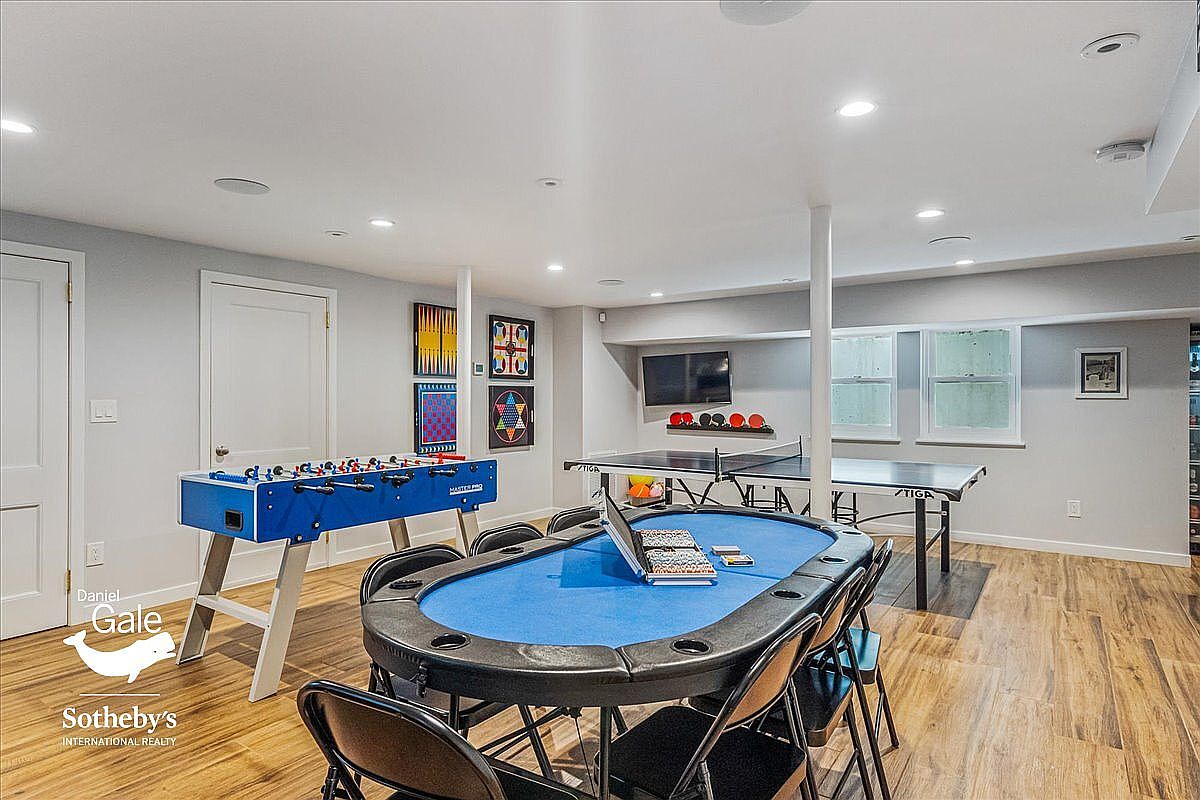 A spacious game room featuring light wood floors and soft gray walls provides the ultimate space for recreation and family bonding. The layout includes a poker table surrounded by comfortable folding chairs, a vibrant blue foosball table, and a full-size ping pong table, encouraging friendly competition for all ages. Bright overhead lights and large basement windows create a warm, inviting atmosphere. Modern art and colorful board games display a playful aesthetic, while built-in shelves and a mounted TV offer convenient storage and entertainment options. This multifunctional area is perfect for gatherings, game nights, and family fun in a relaxed setting.