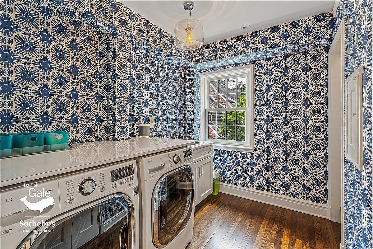 A cheerful laundry room maximizes both form and function with its bright, patterned blue-and-white wallpaper that adds bold visual interest. White cabinetry and a sleek countertop sit above modern front-loading washer and dryer units, providing ample workspace for folding and sorting clothes. Natural light streams in through the classic paned window, offering a view of neighboring homes and softening the geometric design. Warm wood flooring grounds the room, while practical storage bins keep supplies neatly organized—perfect for busy family life. The space feels both welcoming and lively, making daily chores a bit more enjoyable for everyone.
