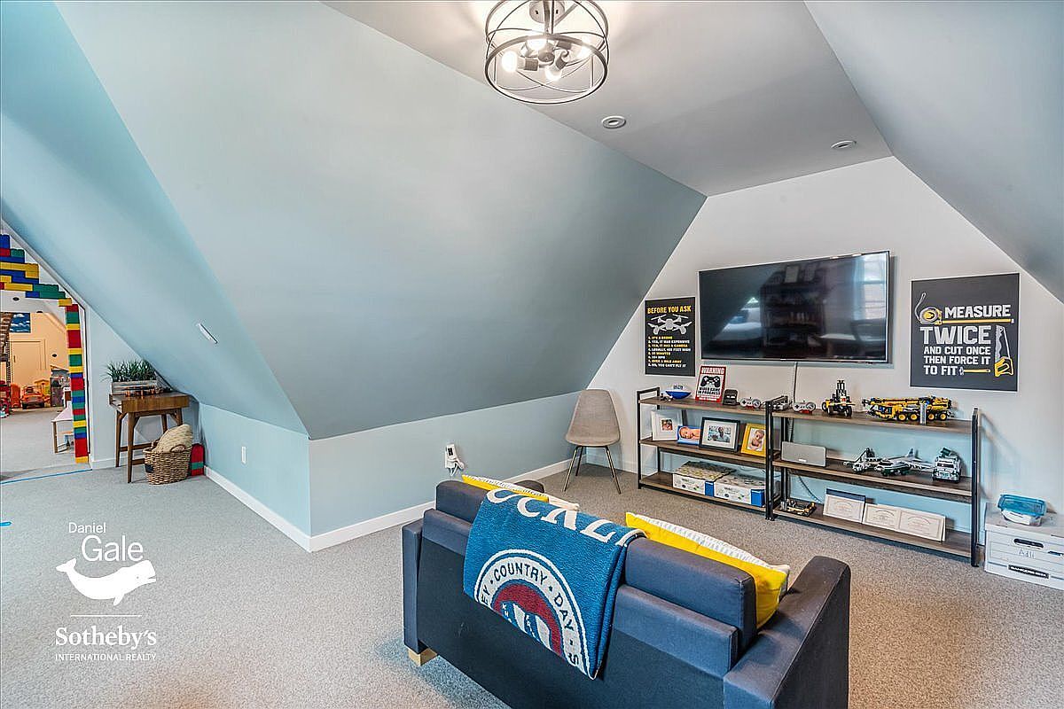 A bright and welcoming attic playroom with playful, sloped ceilings painted in soothing blue tones. The space combines comfort and creativity, featuring a cozy couch with colorful pillows and a soft throw for family lounging. Against the far wall, open shelving holds an impressive collection of toys, model vehicles, and framed family photos. The wall-mounted TV and cheerful decor, including motivational signs, create a fun and motivating environment for kids and parents alike. A whimsical LEGO-brick doorway leads to another play area, and a reading corner with a chair and baskets encourages relaxation and organization.