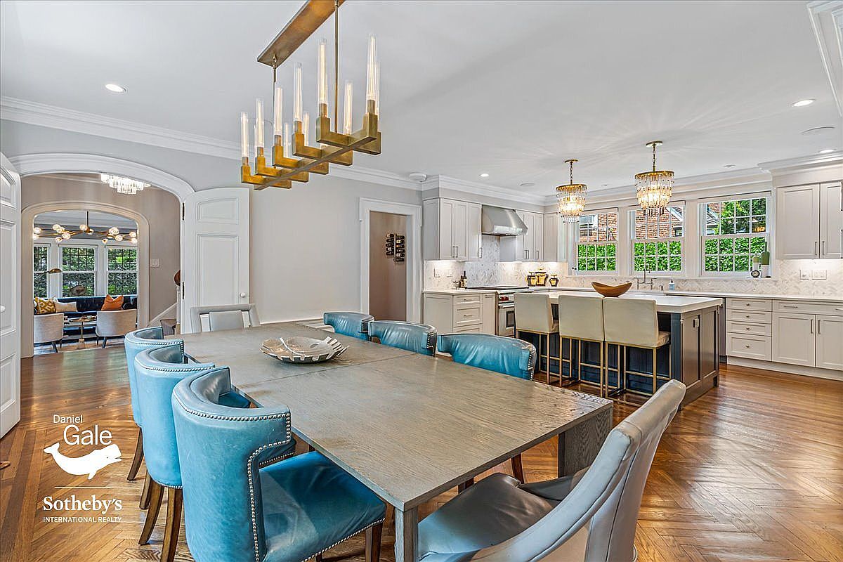 An open-concept dining and kitchen area features a spacious layout perfect for family gatherings. The dining table is paired with plush, turquoise-blue chairs accented with nailhead trim, adding a splash of color and comfort. Modern gold and glass chandeliers illuminate both the dining and kitchen spaces, enhancing the airy atmosphere created by large windows. White shaker-style cabinetry and elegant marble countertops contribute to a bright and inviting kitchen, complete with a central island and stylish barstools. Warm wood flooring runs throughout, providing durability for active families, while the seamless flow encourages togetherness and effortless entertaining.