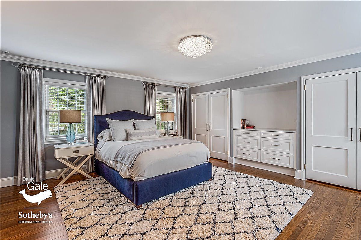 A spacious and serene primary bedroom features a plush navy upholstered bed centered between two sun-filled windows, dressed with elegant silver drapery. The soft gray walls and crisp white trim create a calming backdrop, enhanced by a sparkling crystal ceiling fixture. Family-friendly touches include generous built-in storage with cabinets and drawers, ensuring everything stays organized and clutter-free. A geometric patterned area rug softens the gleaming hardwood floors and provides a cozy play space for children. Classic white nightstands and modern lamps add functionality and style, while the overall layout invites relaxation and comfort for both parents and kids.
