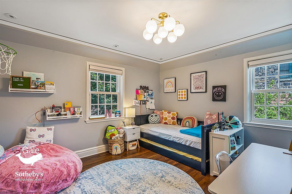 A charming and inviting children’s bedroom thoughtfully designed for both play and rest. Two large windows fill the space with natural light, highlighting soft gray walls paired with warm wooden flooring. Cheerful accents come through in rainbow-themed pillows, plush toys, and playful wall art, creating a happy and cozy atmosphere. A comfy bean bag and a round, blue-patterned rug offer space for reading or lounging. The room features a sleek black bed with a pull-out trundle for sleepovers, shelves for books and toys, a dedicated homework desk, and a basketball hoop, making it as functional as it is fun for kids and families.