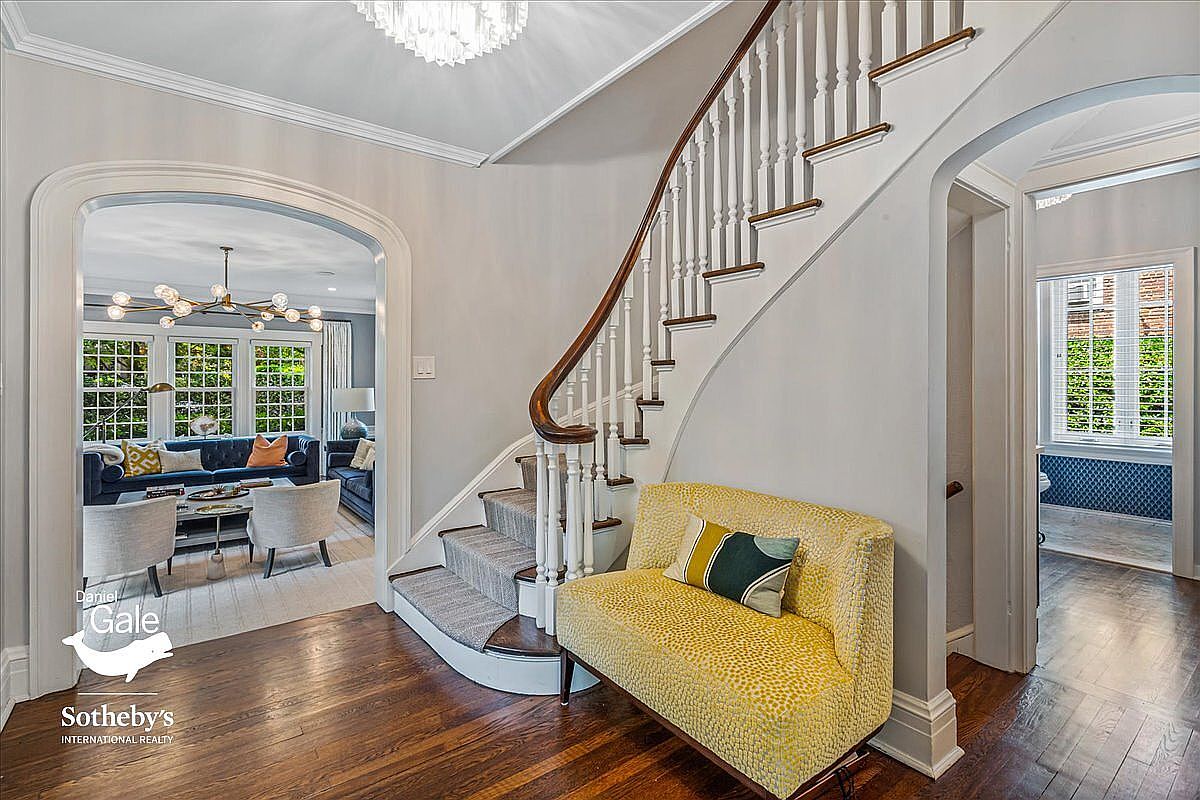 A bright and inviting entryway welcomes guests with its beautiful hardwood floors and graceful curved staircase featuring white balusters and a dark wood handrail. The space feels airy, accentuated by soft gray walls and detailed crown molding. A playful yellow patterned bench offers a cheerful pop of color and practical seating for families, ideal for putting on shoes or greeting visitors. Arched doorways open into a sunlit living room with a modern chandelier, elegant blue sofas, and large windows overlooking lush greenery. The overall layout promotes easy flow between rooms, creating a warm, family-friendly atmosphere.