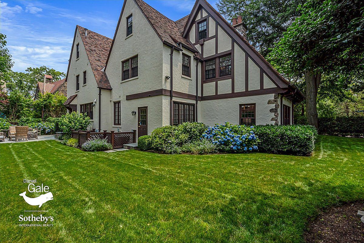 This beautifully maintained backyard showcases a classic American Tudor-style home with charming stucco and wood trim details. The lush green lawn offers plenty of space for children to play, while carefully manicured shrubs and blooming hydrangeas create a vibrant, welcoming atmosphere. The outdoor patio area features a family-friendly setup with ample seating—perfect for alfresco dining or summer gatherings. The neutral cream exterior is complemented by rich wood accents and rustic stonework, adding warmth and historic character. Surrounded by mature trees, the yard feels private and serene, making it ideal for both relaxation and quality family time.
