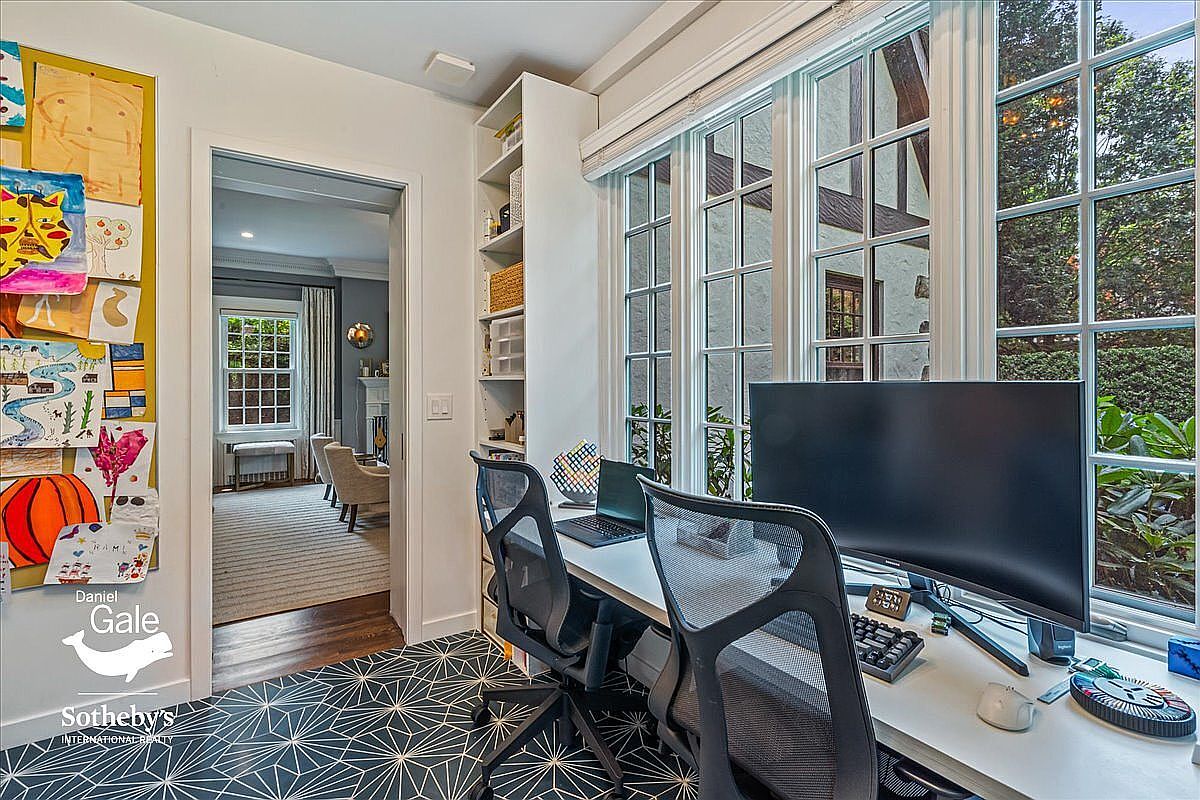 A bright, contemporary home office nook is perfectly designed for productivity and comfort, featuring a long built-in desk with dual workstations and ergonomic mesh chairs. Expansive windows allow abundant natural light to spill into the space, providing a serene view of lush greenery and architectural details outside. Practical open shelving offers ample storage, keeping the space organized and clutter-free. A geometric patterned floor adds visual interest, while the display of children’s artwork fosters a warm, family-friendly atmosphere. The overall palette is neutral and modern, with soft whites and thoughtful touches that balance professional function with a welcoming homey feel.