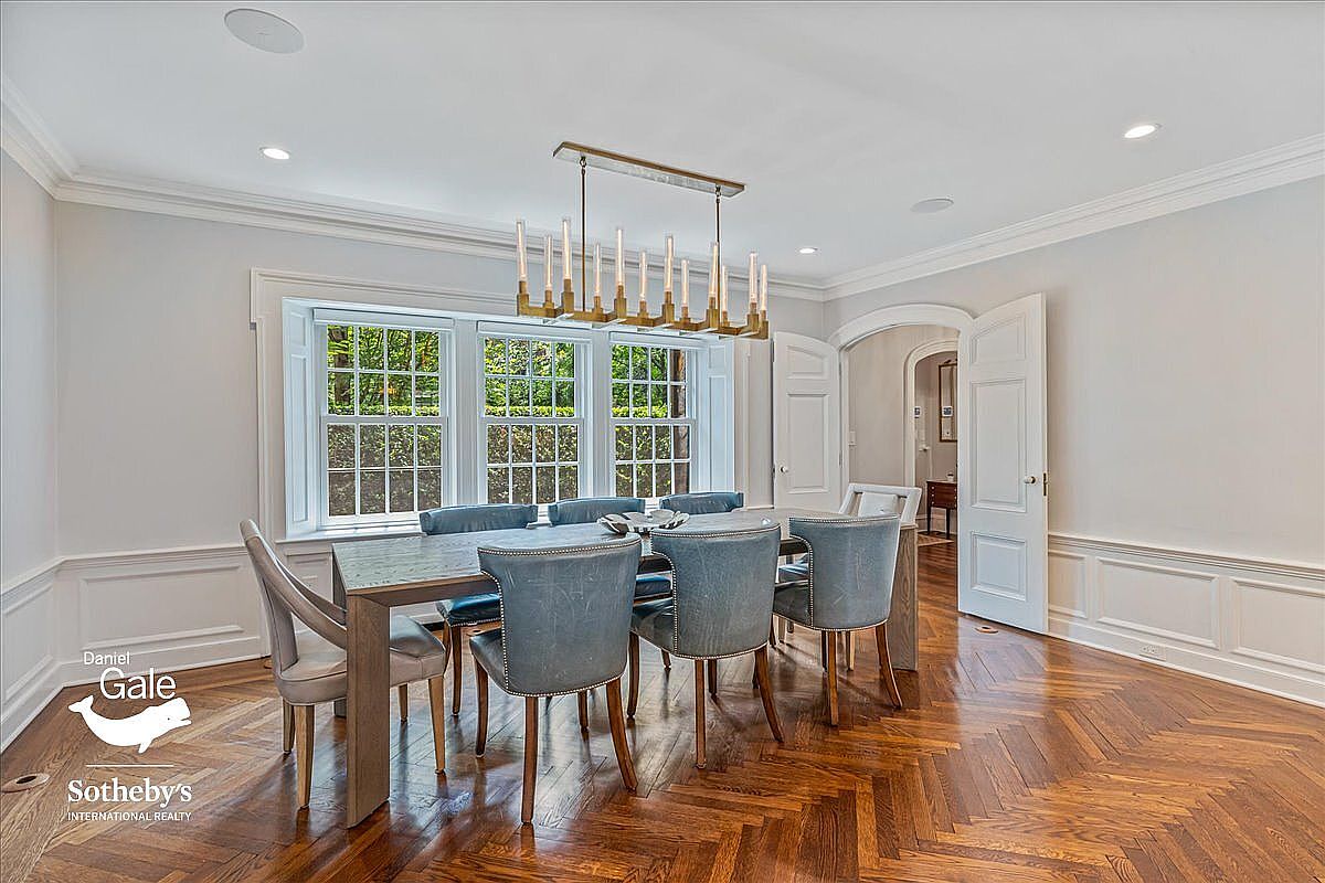 A spacious dining room featuring a large rectangular table surrounded by eight plush, blue upholstered chairs creates the perfect setting for family meals or entertaining guests. Expansive windows along one wall bring in abundant natural light and offer peaceful views of greenery outside, while classic white trim and wainscoting lend elegance to the space. The striking geometric herringbone pattern of the wood floor adds warmth and visual interest, complemented by a modern, gold chandelier overhead. An arched doorway provides an inviting transition to the rest of the home, making the area ideal for both daily living and festive occasions.
