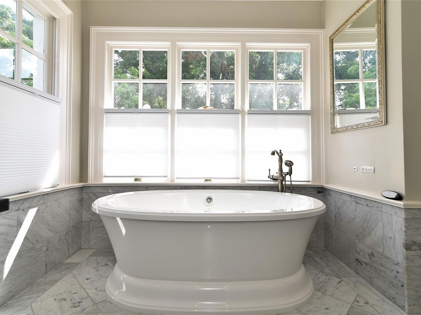 Bright and inviting, this luxurious bathroom features a freestanding tub positioned near large windows that fill the space with natural light. The elegant marble surrounding the tub enhances the serene ambiance, while the subtle beige walls create a warm backdrop. High ceilings and intricate molding details add sophistication, reflecting timeless design elements. Thoughtfully placed fixtures offer both functionality and style, marrying comfort with luxury. Modern amenities are seamlessly integrated, ensuring a family-friendly environment. The picturesque views of greenery outside promote relaxation, making this space a perfect retreat for unwinding after a long day.