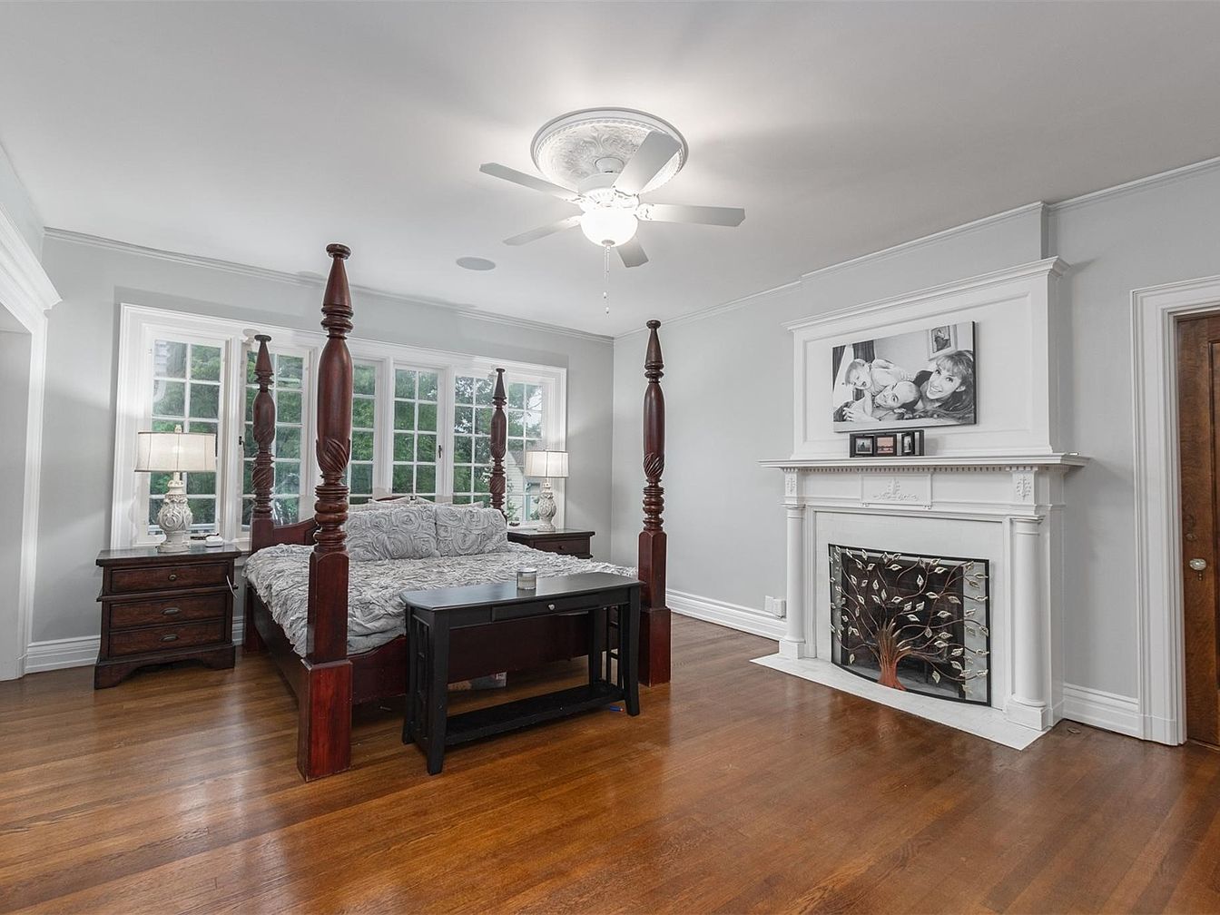 This elegant master bedroom showcases a harmonious blend of comfort and sophisticated design. Dominating the space is a grand four-poster bed that exudes timeless charm, complemented by meticulously crafted nightstands adorned with stylish lamps, offering a warm glow. The intricate details of the fireplace mantle, accentuated by a modern art piece, create a focal point that invites relaxation. Neutral gray walls enhance the room’s spaciousness, while rich hardwood floors add warmth and depth. Ample natural light filters in through large windows, perfectly framing serene outdoor views, making this space ideal for unwinding after a busy day.