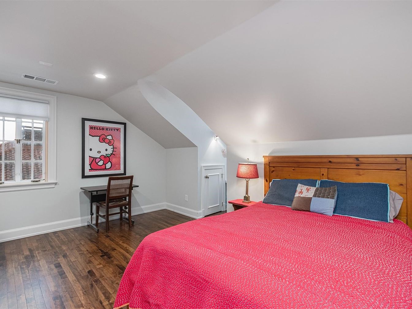 This cozy bedroom retreat features angled ceilings and a spacious layout, creating a warm and inviting atmosphere. The rich wooden flooring complements the rustic charm of the wooden bedframe, adorned with a vibrant red quilt that adds a pop of color. A charming desk by the window promotes creativity or study, while a Hello Kitty poster brings a touch of playful decor. Soft, neutral walls enhance the feeling of space, illuminated by bright overhead lighting. The room balances functionality with family-friendly elements, making it perfect for relaxation or productivity, all within a well-designed and aesthetically pleasing environment.