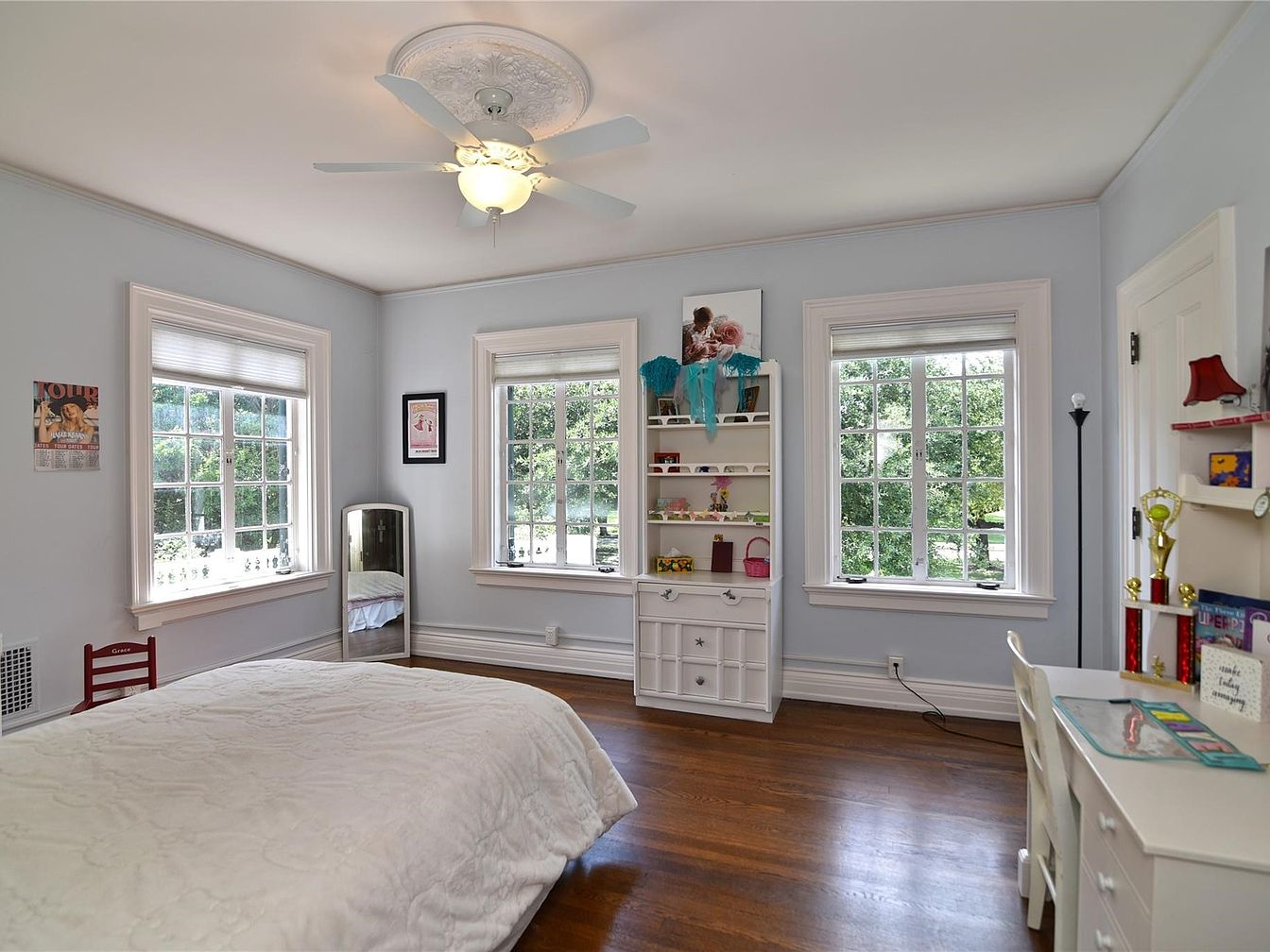 Bright and inviting, this kid’s bedroom features soft blue walls that create a serene atmosphere, complemented by large windows that flood the space with natural light. The warm, polished hardwood floor adds richness, while the white bedding offers a cozy touch. A cheerful shelf displays colorful toys and decorations, fostering creativity and playfulness. A small writing desk provides a dedicated space for homework and crafts, encouraging focus and learning. The ceiling fan ensures a comfortable environment, making this room not only aesthetically pleasing but also functional and family-friendly, perfect for a growing child.