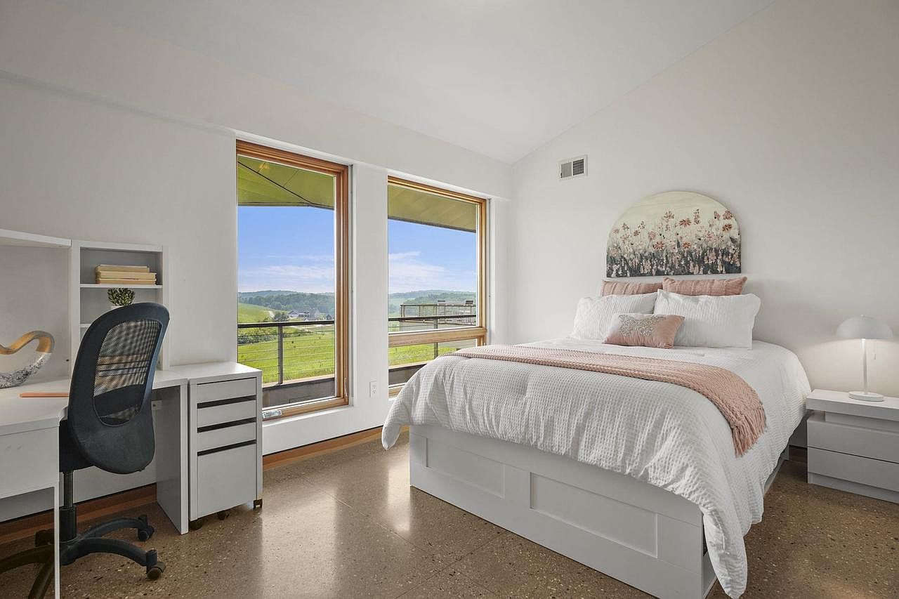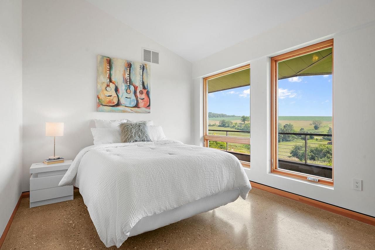 A bright and serene bedroom featuring large windows that frame breathtaking countryside views, allowing natural light to flood the space and create a peaceful atmosphere. The minimalist layout includes a queen-sized bed adorned with textured white bedding and a fluffy accent pillow. Family-friendly touches include a sturdy nightstand topped with a small lamp and books. The subtle cork flooring adds warmth and durability, perfect for families. Above the bed, a colorful painting of three guitars adds a playful, artistic touch, while the simple white walls and understated furnishings keep the room feeling open, restful, and welcoming.