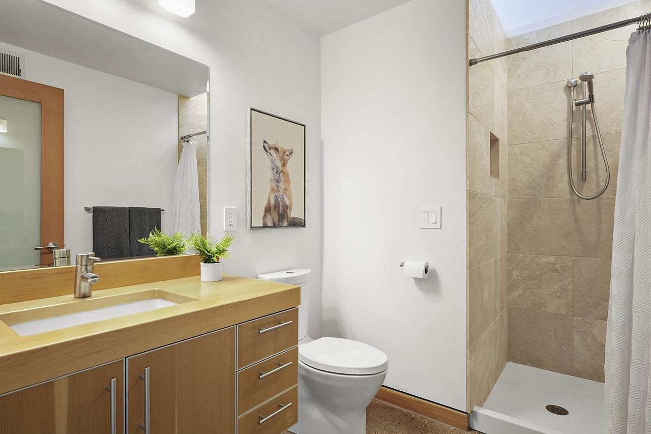 A contemporary bathroom design with a warm wooden vanity, sleek chrome fixtures, and ample under-sink storage. The neutral palette, highlighted by beige tiled walk-in shower, brings a sense of calm while remaining practical for daily family routines. A whimsical fox print adds character and child-friendly charm, balancing the clean lines and minimalistic decor. The large mirror and bright overhead lighting enhance the room’s spacious feel, while the lush green plant introduces a fresh touch. Thoughtful details, such as a handy towel bar and accessible toilet paper holder, produce a welcoming, organized space suitable for both adults and children.