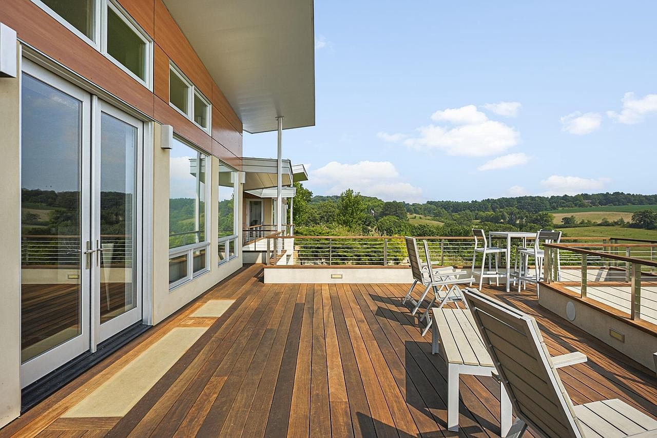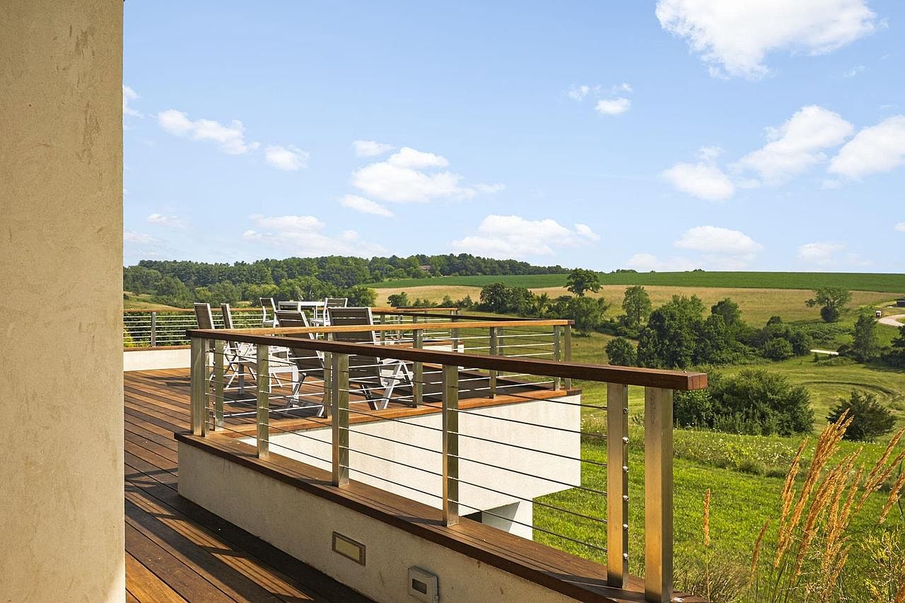 Expansive wooden deck overlooking rolling hills and open fields, the perfect spot for family gatherings or quiet moments in nature. The deck features sleek metal and wood railings that add a touch of modern elegance while ensuring safety for children. Arranged with comfortable outdoor furniture, the space is ready for alfresco dining or relaxing with a book. Neutral stucco walls blend seamlessly with the earthy brown tones of the deck, enhancing the natural aesthetic. Large open spaces make it accessible and friendly for all age groups, while panoramic views provide a serene, welcoming atmosphere for making memories together.