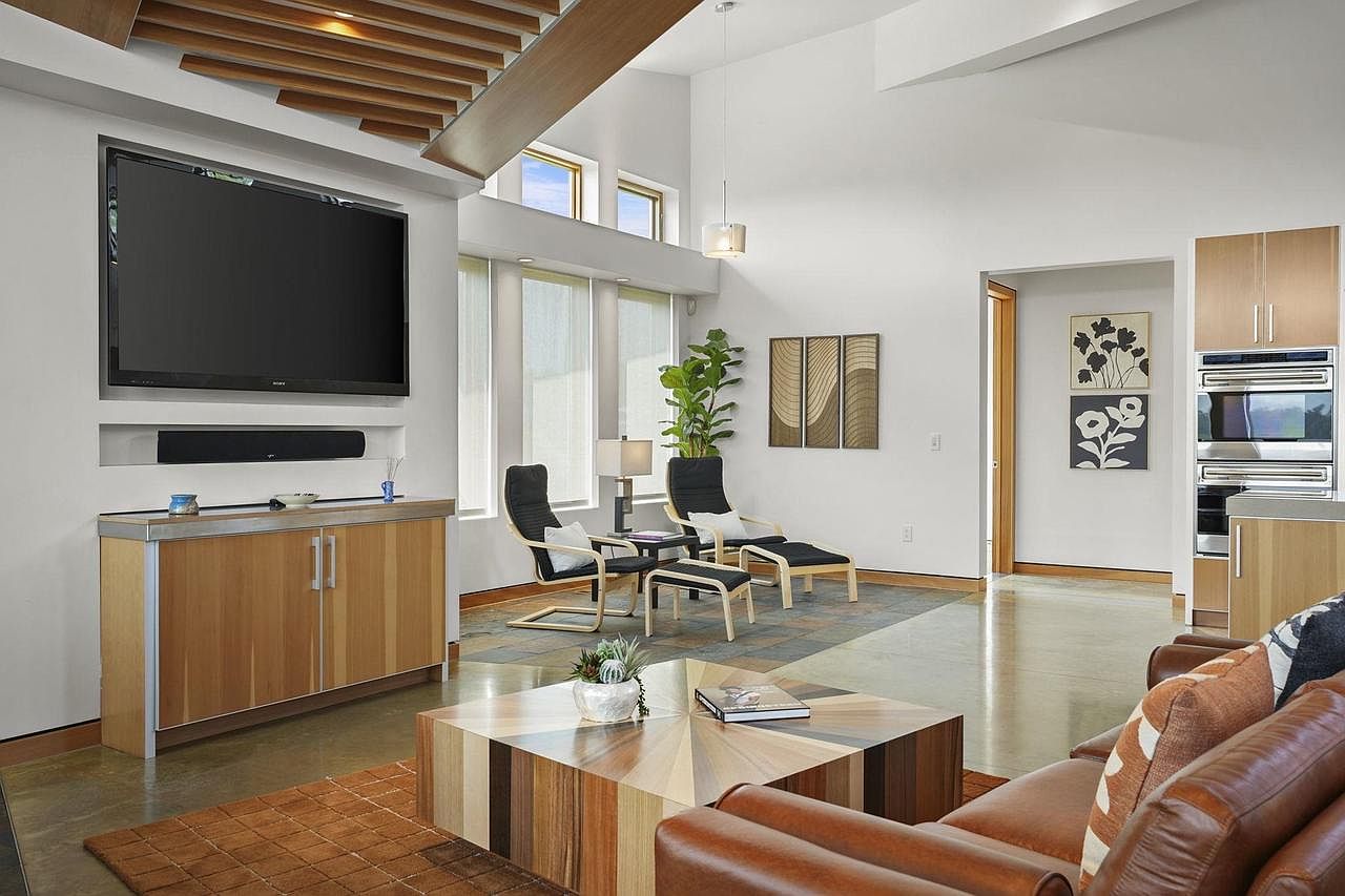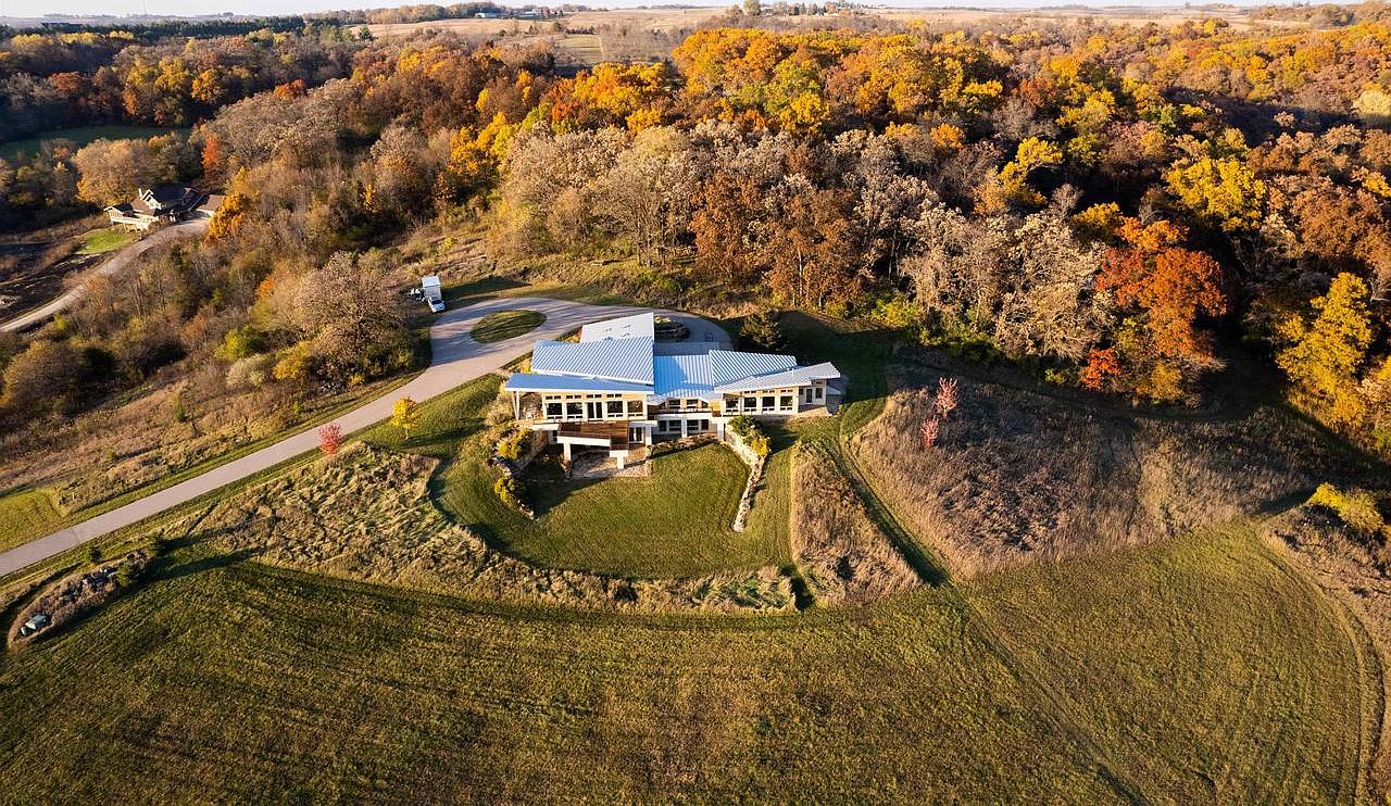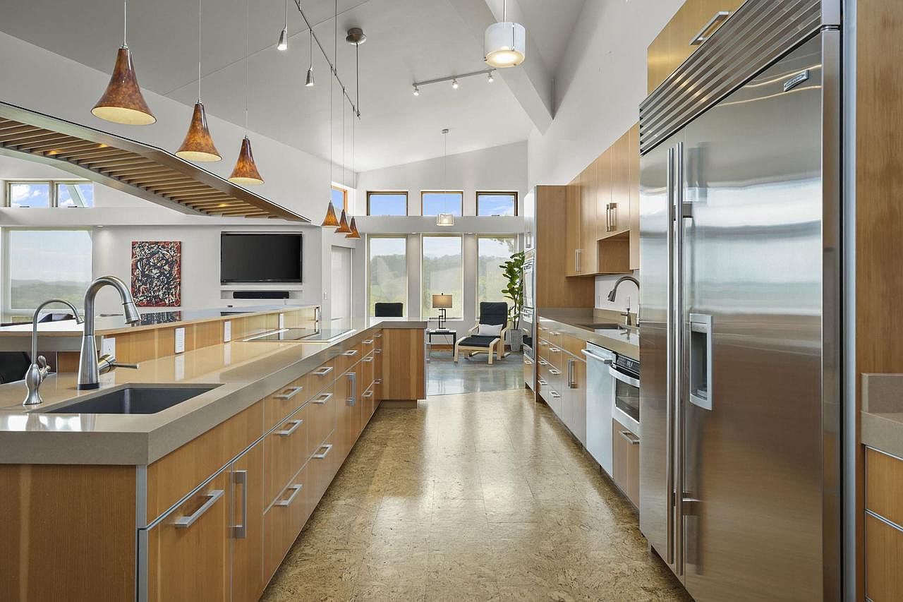 This hilltop Verona, WI residence epitomizes status appeal and vision, blending Frank Lloyd Wright-inspired midcentury modernism with Frank Gehry’s contemporary flair. Perched on a private 15.5-acre estate with expansive Driftless views and mature woods, the home’s sustainable design, featuring Eco-clad siding, SIPs construction, and a Brazilian Ipe deck, underscores its future-oriented ethos. Built recently, it boasts a chef’s kitchen with Subzero/Wolf appliances, advanced audio systems, geothermal heating/cooling, radiant floors, and triple-pane Loewen windows, all keeping annual HVAC costs astonishingly low. The vast great room and unfinished lower beds/baths offer further customization. Listed at $2,500,000, this masterpiece radiates architectural innovation, privacy, and luxury, making it perfect for accomplished, forward-thinking owners.