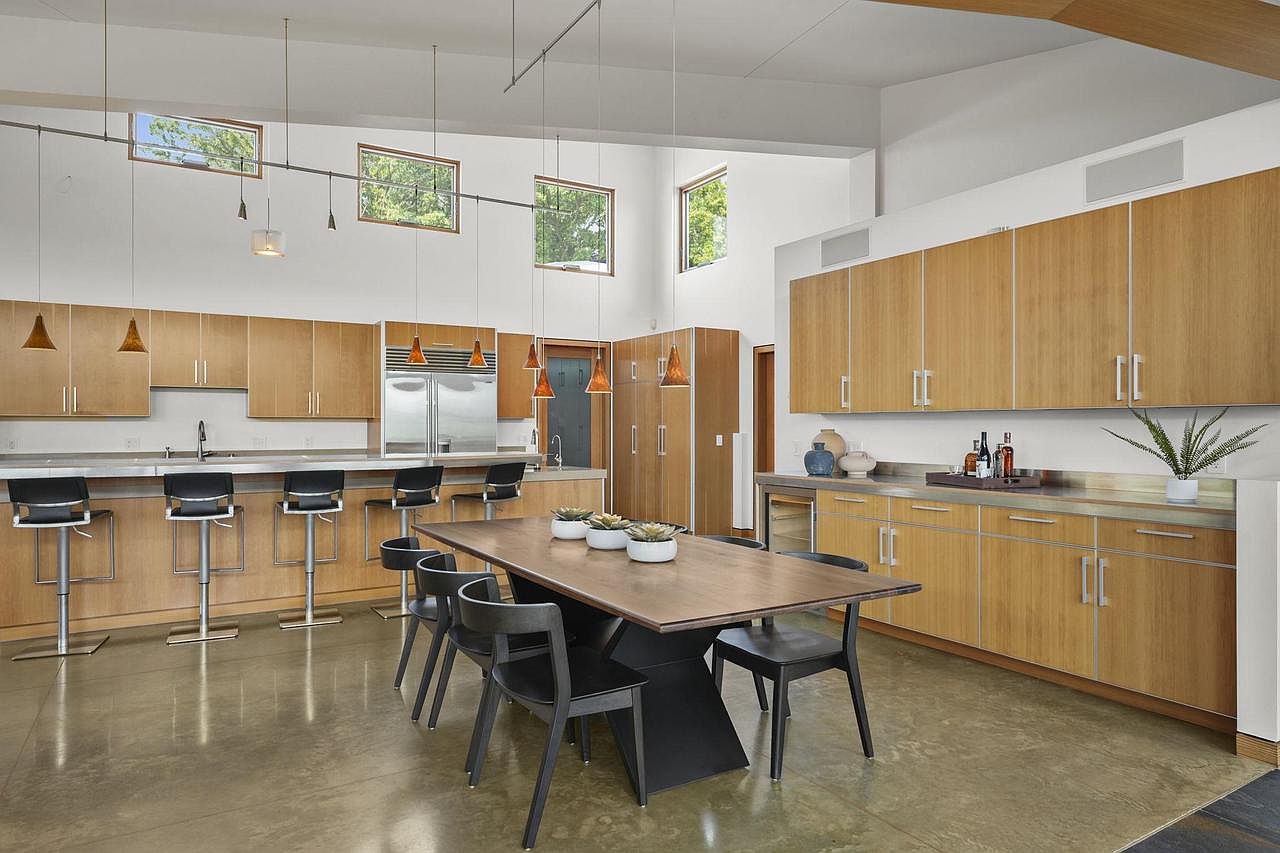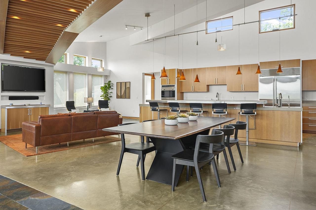 A spacious, open-concept kitchen and dining area features sleek wood cabinetry and an expansive central island with modern bar seating, ideal for family gatherings or entertaining guests. The high ceilings and crisp white walls enhance the room’s airy atmosphere, while large transom windows bathe the space in natural light. Minimalist black chairs surround a statement dining table, and geometric pendant lights add contemporary flair. The polished concrete floors are both stylish and practical for active households. Stainless steel appliances, uncluttered counters, and ample storage ensure functionality, making the space both family-friendly and inviting.