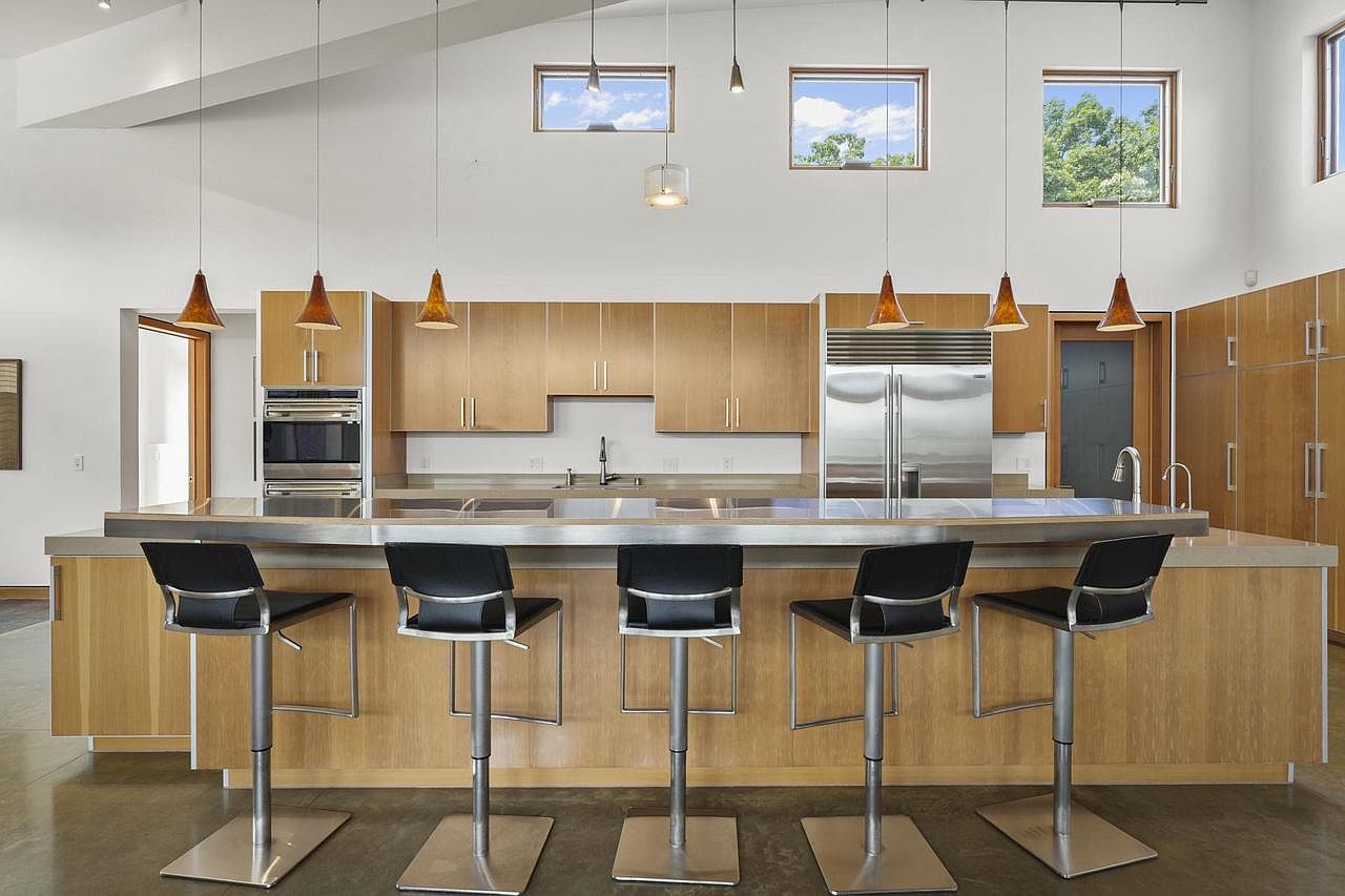 A sleek, contemporary kitchen features a generous island with seating for five, making it ideal for casual family meals or gatherings. Warm wood cabinetry lines the walls, providing ample storage and a clean, uniform look accented by modern metallic handles. The stainless steel surfaces and appliances, including a double-door fridge and built-in ovens, reflect light and add a professional touch. Amber pendant lights hang above the island, casting a cozy glow and adding visual warmth. High ceilings and multiple windows flood the space with natural light, creating an inviting, open atmosphere perfect for family interaction and shared activities.