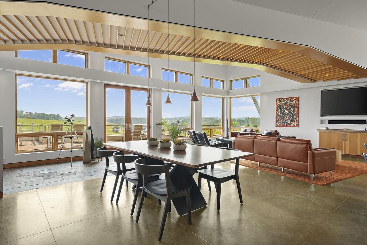 Flooded with natural light, this airy open-concept space seamlessly connects the dining and living areas. Expansive windows frame beautiful countryside views, enhancing the tranquil atmosphere. A modern dining table with sleek black chairs sits under statement pendant lights, while the adjacent sitting area features rich, caramel-toned leather sofas and a large television, ideal for family gatherings and movie nights. Warm wooden accents in the ceiling and cabinetry add coziness, enlivened by a bold art piece on the wall. Sliding doors lead to a deck, blending indoor-outdoor living and providing ample space for entertaining or relaxing together.