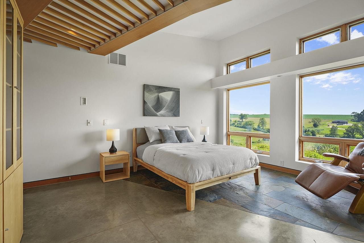 A spacious master bedroom emphasizes comfort and serene simplicity, featuring large windows that invite natural light while providing sweeping countryside views. The room’s palette centers on soft neutrals and light wood, balancing modern minimalism with warmth. Clean lines of the platform bed and matching nightstands create a cohesive, inviting atmosphere, complemented by cozy lamps for gentle evening lighting. The unique wood ceiling detail and open flooring layout make the space feel airy and welcoming. A leather lounge chair in the corner offers a family-friendly nook for reading or relaxing, ideal for both quiet retreats and shared moments.