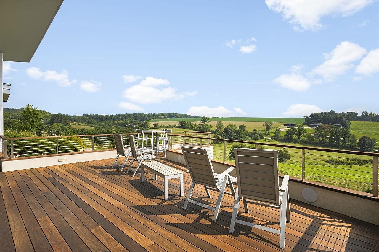 Expansive wooden decking offers a welcoming outdoor space perfect for family gatherings or relaxation. The layout features multiple seating options, including lounge chairs and a simple bench, making it ideal for both entertaining guests and lounging with children. A high-top table with chairs encourages al fresco dining with sweeping views of the lush, rolling countryside. Clean lines and sturdy railings provide both safety and style, allowing families peace of mind. The natural wood tones of the decking harmonize beautifully with the soft gray of the seating, creating a modern yet warm aesthetic that connects seamlessly with the surrounding landscape.