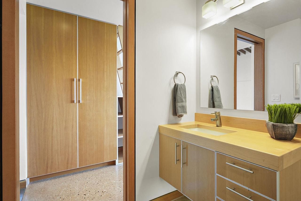 A clean and modern bathroom vanity area features warm wood cabinetry and sleek, brushed metal hardware for a contemporary yet welcoming feel. The spacious countertop offers ample room for toiletries and everyday essentials, making it family-friendly and easy to keep organized. A large wall mirror above the sink enhances the space with reflected light, while simple grey hand towels add a touch of softness. Neutral off-white walls complement the natural wood finish, and the built-in storage options contribute to a clutter-free atmosphere. The overall design is practical and visually calming, perfect for daily routines in a busy household.