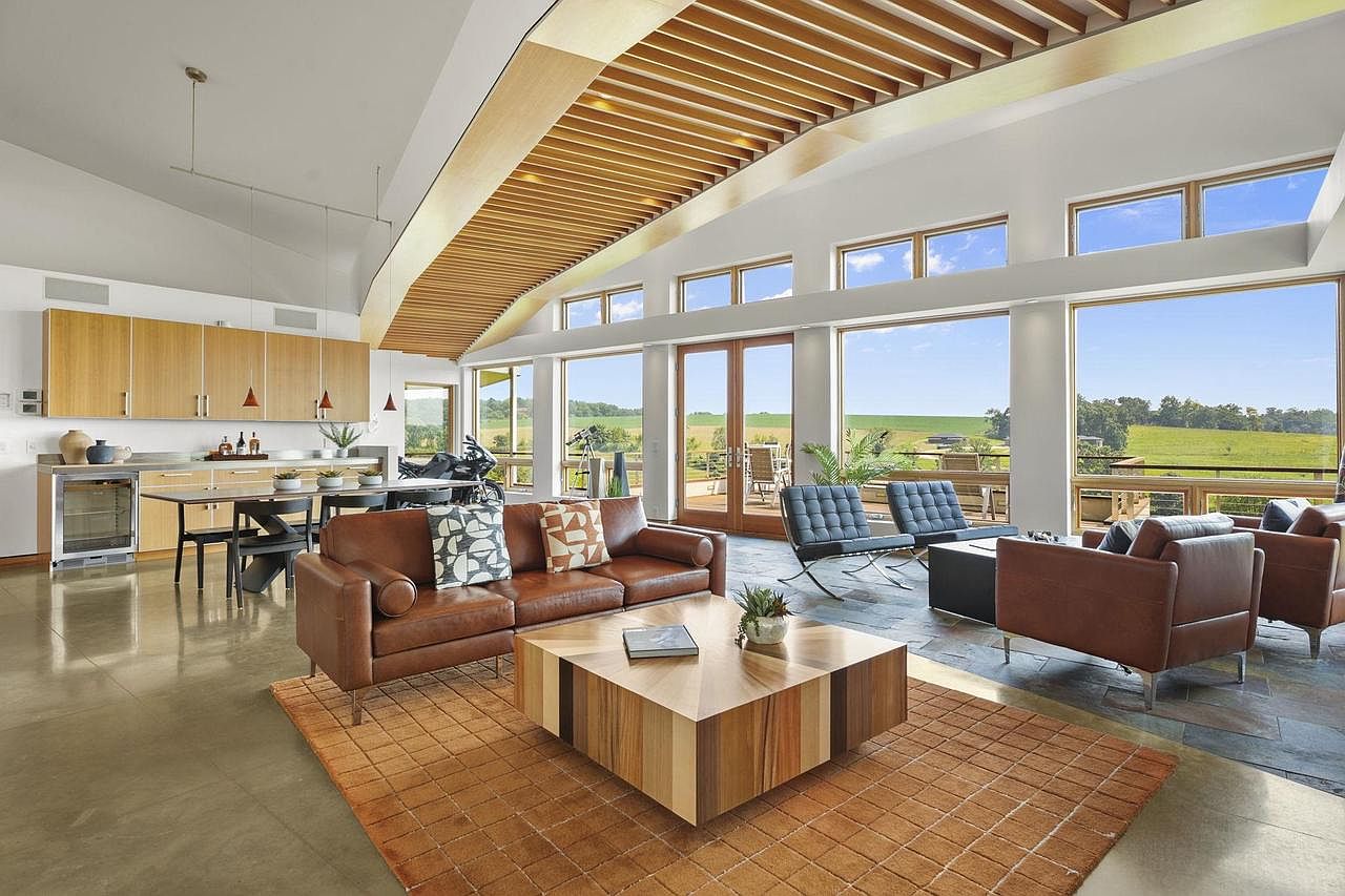 This spacious open-plan living area seamlessly combines a lounge, dining, and kitchen space, designed to maximize both comfort and natural light. Floor-to-ceiling windows wrap around the room, offering expansive views of the countryside and allowing sunlight to flood the interior. The earthy color palette features warm brown leather sofas, mid-century modern armchairs, a matching grid-patterned rug, and wood cabinetry. A dramatic wooden slatted ceiling adds visual interest overhead. The layout is welcoming and practical for families, with plenty of seating, accessible surfaces for games or homework, and a dining area ideal for gatherings. Sliding doors lead directly to an outdoor deck, enhancing indoor-outdoor living.