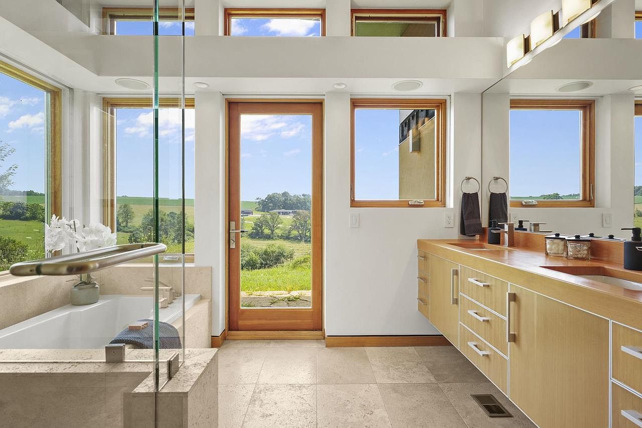 A bright, contemporary bathroom features floor-to-ceiling windows and a glass-panel door offering sweeping views of rolling green countryside. Natural light floods the space, enhancing the light wood cabinetry and warm-toned stone surfaces. The deep soaking tub is positioned perfectly to gaze out at the scenery, while a spacious double vanity provides ample storage and workspace for family routines. Thoughtful design encourages relaxation and family convenience, with sturdy fixtures and a calm, neutral palette that complements the outdoors. High ceilings and expansive windows create an open atmosphere, making the bathroom feel both luxurious and welcoming for daily use.