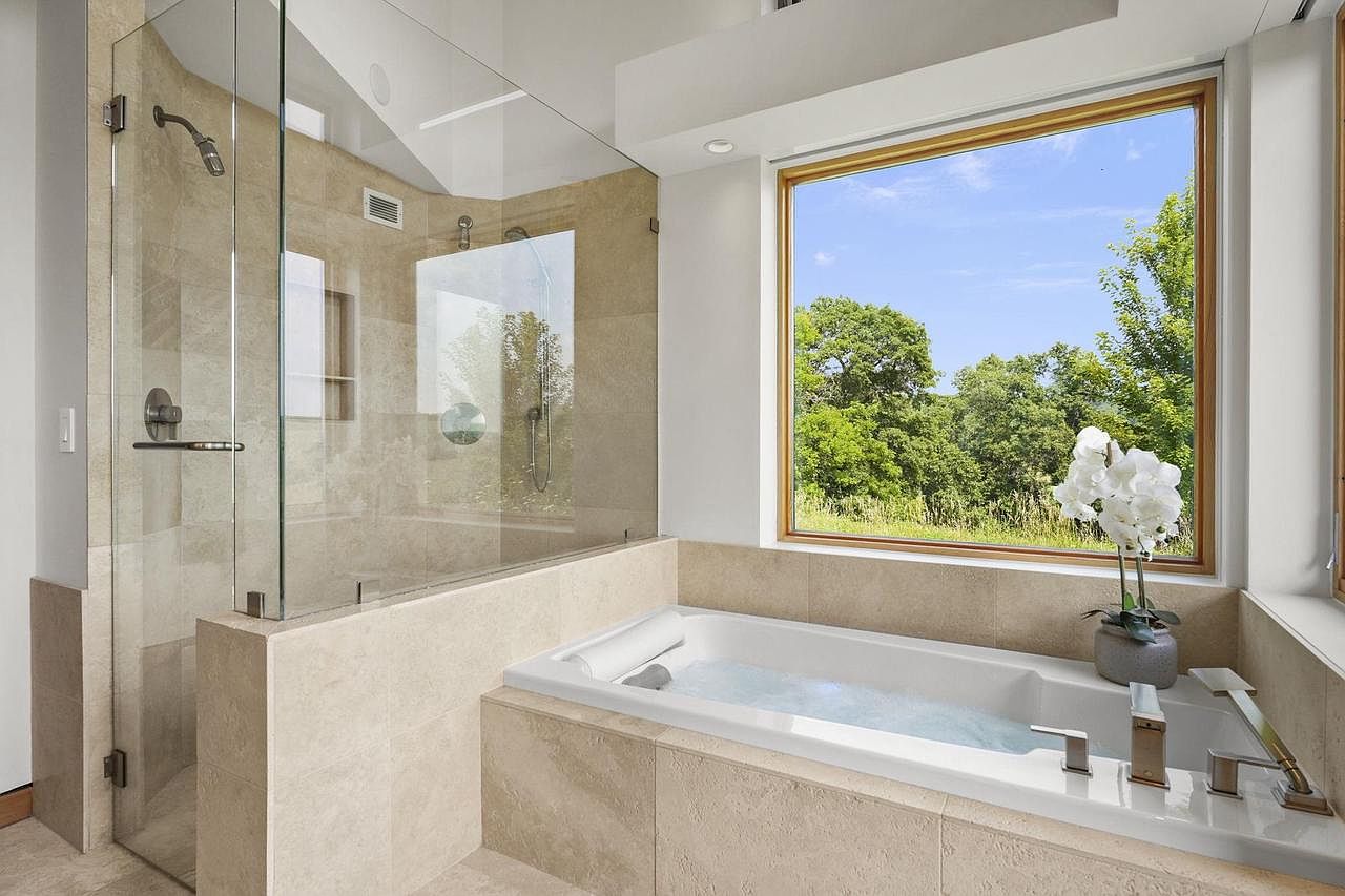 Sleek, modern design defines this spa-inspired master bath, where a glass-enclosed walk-in shower sits elegantly beside a deep soaking tub. Neutral-toned stone tiles imbue a sense of calm and continuity, while the large picture window frames serene views of nature, filling the space with natural light. Minimalist chrome fixtures and a simple vase of white orchids add stylish accents, making the room both sophisticated and inviting. The open layout offers ample space for family use, and the easy-to-clean surfaces cater to busy lifestyles, combining luxury with practical family-friendly features for a harmonious retreat.