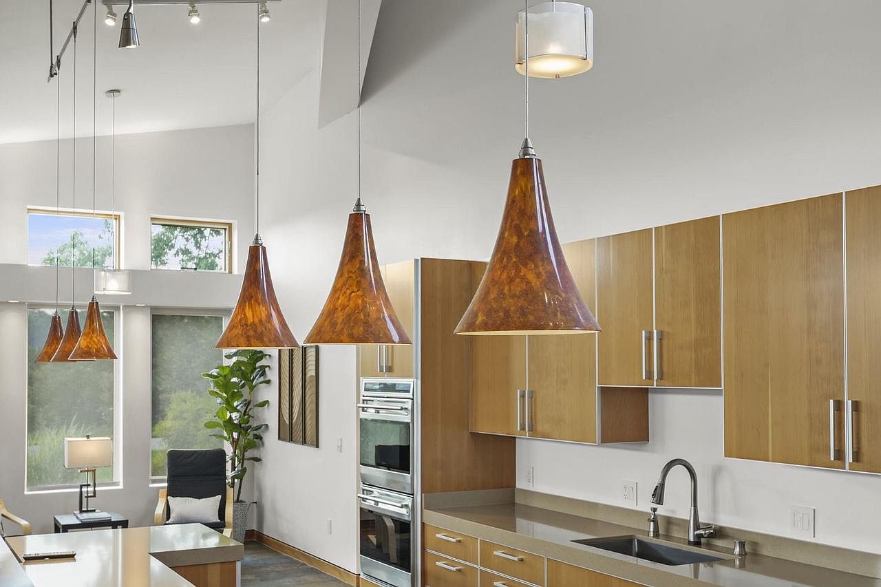 Warm wood cabinetry brings a sense of coziness to this modern kitchen, complemented by unique cone-shaped pendant lights in amber tones. The open-plan design seamlessly connects the kitchen with a sitting area, making it ideal for family gatherings and entertaining guests. Ample natural light pours in through large windows, highlighting the clean lines and neutral color palette. Stainless steel double ovens, sleek countertops, and organized cabinetry provide a functional and family-friendly workspace. A comfortable chair and indoor plant near the windows create a welcoming nook for relaxation, making this space both inviting and practical for daily living.