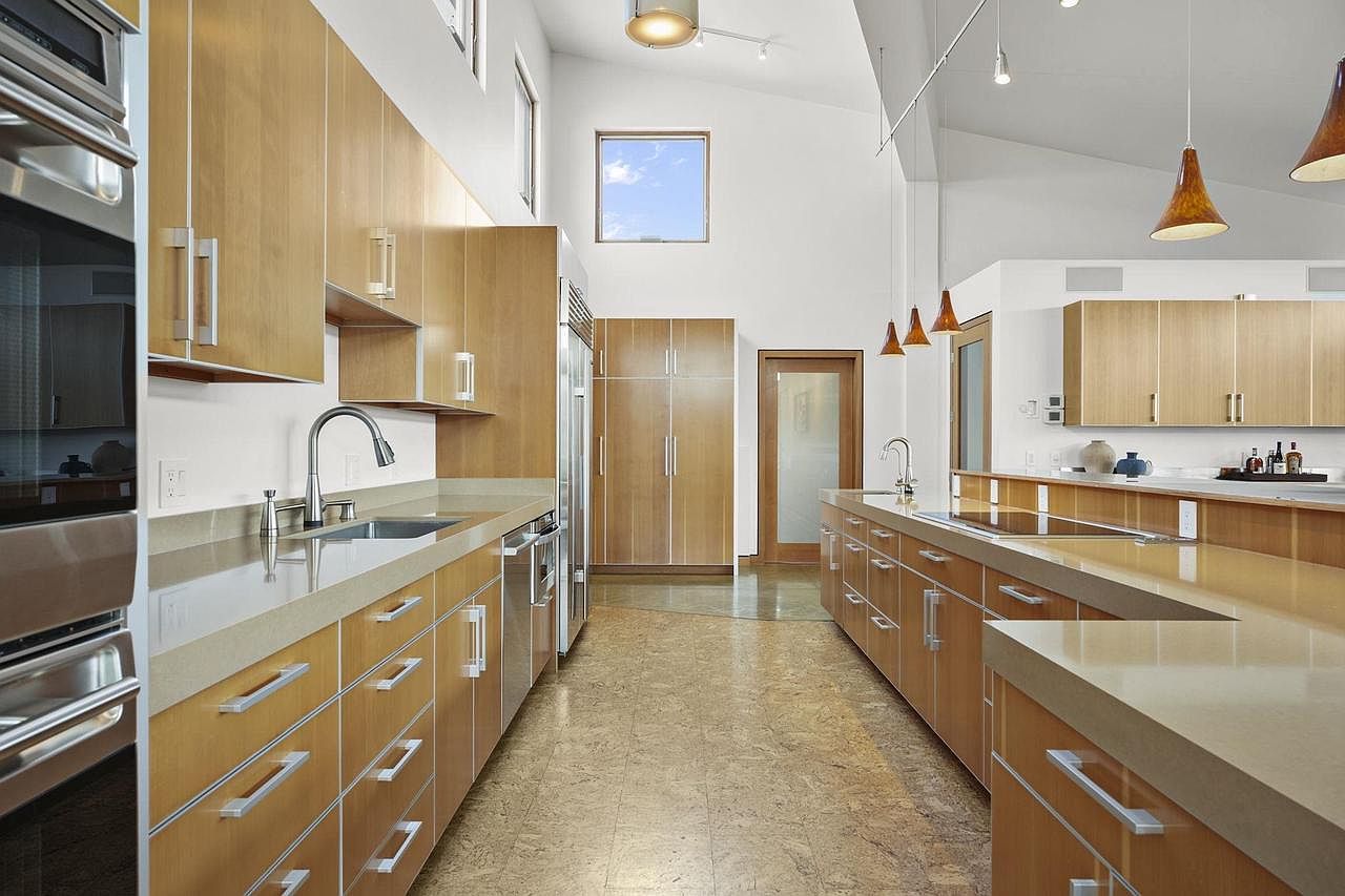 This spacious kitchen highlights contemporary design with its sleek, natural wood cabinetry and clean lines. Expansive quartz countertops provide ample space for meal prep and family gatherings, while stainless steel appliances blend seamlessly for a polished look. A generous island with bar seating encourages casual meals and conversation, perfect for busy families. Pendant lights add a warm ambiance, and multiple windows allow natural light to fill the room, creating a bright, welcoming atmosphere. The layout offers plenty of storage, including tall cabinets and deep drawers, keeping the space tidy and functional. Open shelving and neutral tones enhance the airy, modern vibe.