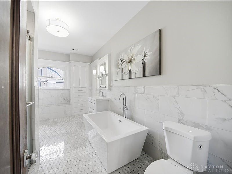This elegant bathroom features a spacious layout designed for comfort and style. The centerpiece is a luxurious freestanding soaking tub, positioned to create a serene atmosphere, complemented by chic wall art showcasing floral motifs. Subtle gray walls enhance the contemporary vibe, while the stunning marble tiling, both on the floor and walls, reflects sophistication. Ample storage is provided by sleek cabinetry, ensuring organization without sacrificing aesthetics. Bright, natural light streams through strategically placed windows, harmonizing with polished fixtures and clean lines. Every detail, from the lighting to the finishes, encourages relaxation and invigoration in a family-friendly space.