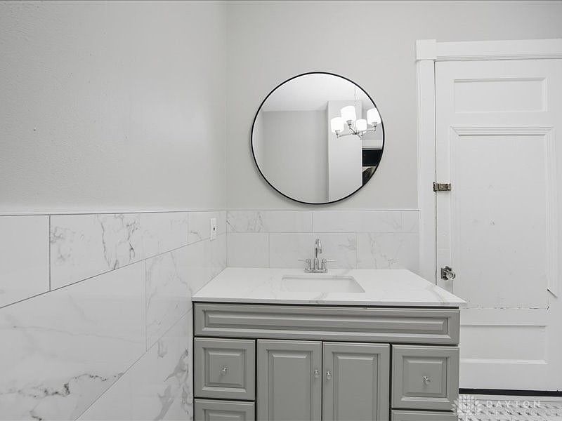 This modern bathroom features a sleek layout enhanced by elegant marble tiles that extend across the wall. A minimalist gray vanity provides ample storage while exuding sophistication, complemented by a clean white countertop. Above, a round mirror enhances the sense of space and reflects light from the stylish chandelier, creating a warm ambiance. The color scheme of soft grays and whites contributes to a serene atmosphere, ideal for family use. The classic door adds a touch of architectural detail, balancing contemporary elements with traditional charm, making this space both functional and welcoming.