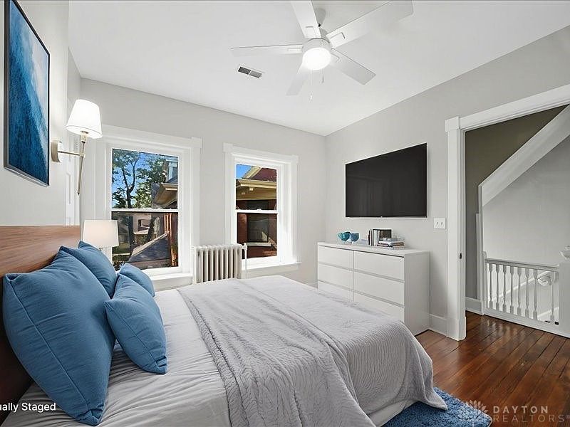 This serene master bedroom features a thoughtfully designed layout that promotes relaxation and comfort. Bright and airy, it showcases soft gray walls complemented by rich hardwood floors. Large windows invite natural light, offering delightful views and enhancing the warm atmosphere. A plush bed adorned with oversized blue cushions serves as the centerpiece, while sleek nightstands with modern lamps create a cozy ambiance. The minimalist white dresser provides ample storage, harmonizing with the room’s clean lines. A mounted television adds contemporary flair, and the ceiling fan ensures a refreshing breeze, making it a welcoming space for unwinding.
