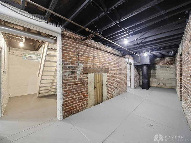 This versatile basement area showcases exposed brick walls, evoking a rustic yet modern charm. The room features a spacious layout, allowing for various configurations to suit family needs, from storage to recreational use. A neutral color palette, highlighted by the light gray floor, creates an inviting atmosphere. Natural light filters in through a small window, enhancing the airy feel. The black ceiling and visible piping contribute to an industrial aesthetic, while the wooden-door entry adds character. This adaptable space is perfect for a family seeking additional functionality in their home, ready for personalization and creativity.