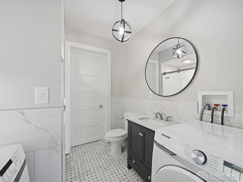 This laundry room strikes a balance between functionality and aesthetic appeal, featuring a sleek layout designed for efficiency. The space boasts a modern vanity with a striking dark wood finish, paired with elegant marble backsplash accents that create a chic contrast against the soft gray walls. A circular mirror enhances the room’s brightness, complemented by contemporary pendant lighting that adds a touch of sophistication. The spacious setup includes a well-placed washer and dryer, optimizing convenience, while the patterned floor tiles provide a stylish yet practical surface. Overall, the design seamlessly integrates practicality with stylish comfort.