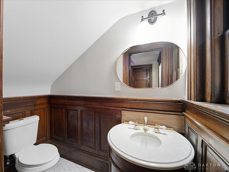 This inviting bathroom combines classic elegance with modern convenience. A gracefully curved vanity with a marble countertop enhances the timeless appeal, while the ornate fixtures add a touch of luxury. Rich, dark wood paneling wraps around the room, contrasting beautifully with the soft gray walls. Natural light streams in through a strategically placed window, illuminating the unique architectural angles of the sloped ceiling. A round mirror complements the overall aesthetic, providing a sleek focal point. Practical family-friendly features, such as ample storage and a well-placed toilet, ensure functionality alongside the stunning design.