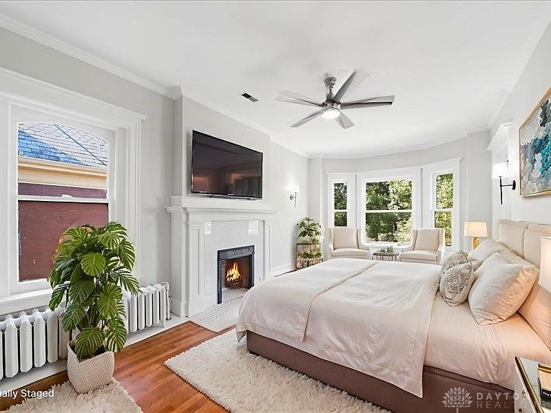 This elegant master bedroom features a tranquil aesthetic with carefully curated design elements. A spacious layout is enhanced by a cozy seating area beside large bay windows, inviting natural light and picturesque views. The soft color palette of muted greys and whites creates a serene environment, while warm hardwood flooring adds a classic touch. A stylishly designed fireplace serves as a focal point, complemented by a modern TV mounted above. Plush bedding and decorative pillows ensure comfort, and greenery from the potted plant introduces a refreshing touch of nature, making this space an ideal family-friendly retreat.