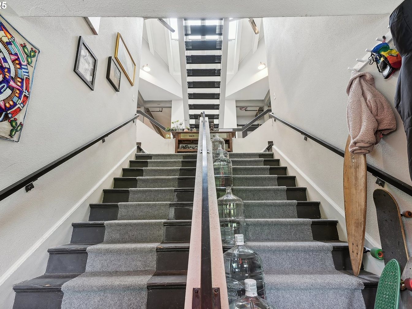 This inviting stairway blends functionality with style, showcasing a modern design that enhances the home’s aesthetic appeal. The sleek black stairs, paired with soft gray carpeting, offer both comfort and safety for families. Flanking the staircase, natural light floods in from skylights above, illuminating the space and creating an airy atmosphere. Eclectic artwork adorns the walls, adding a splash of color and personality. Practical features like hooks for coats and a spacious landing cater to everyday needs, while decorative glass vessels create a visually interesting focal point, demonstrating a thoughtful arrangement of aesthetics and livability.